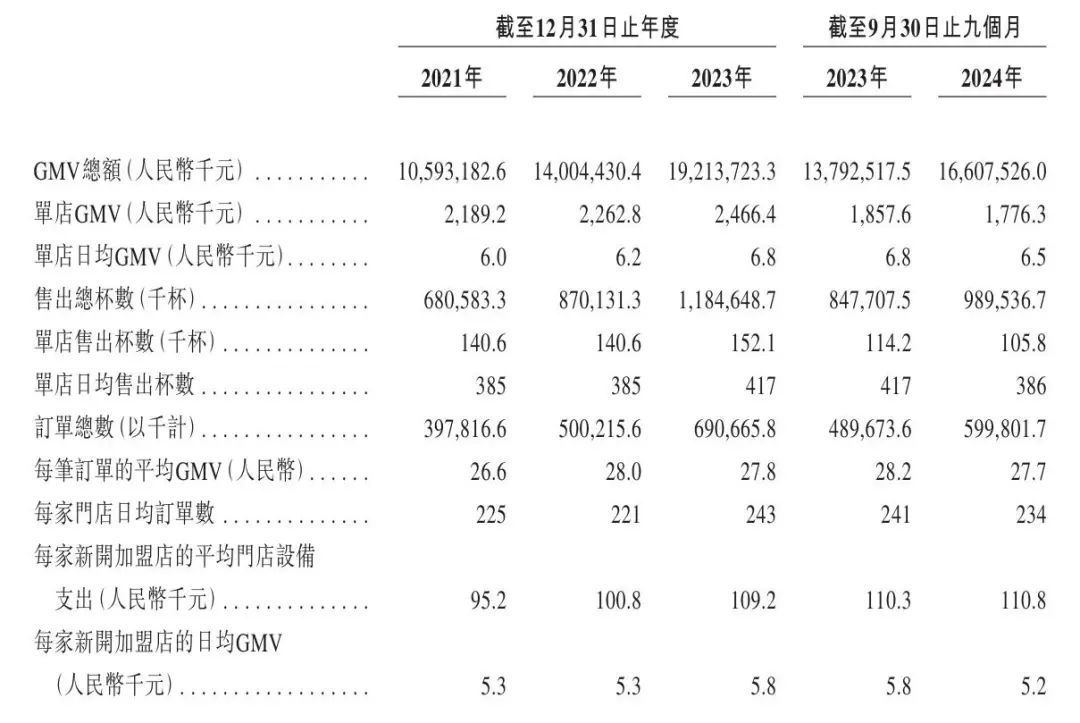 根据招股书披露,2024 年前 9 个月,公司单店 GMV 为 177.6 万元,相较上年同比减少 4.38%;同期单店售出杯数 10.58 万杯,同比减少 7.36%;每笔订单的平均 GMV 为 27.7 元,同比减少 1.77%;每家门店的日均订单数为 234 单,同比减少 2.9%。