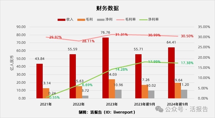 公司过去三年业绩呈现爆发增长,收入、毛利复合年增速超过 30%,净利复合年增速高达 576%;2024 年前 9 月收入、毛利、净利增速有所放缓,但毛利率保持 30% 以上高位,净利率超 17%。