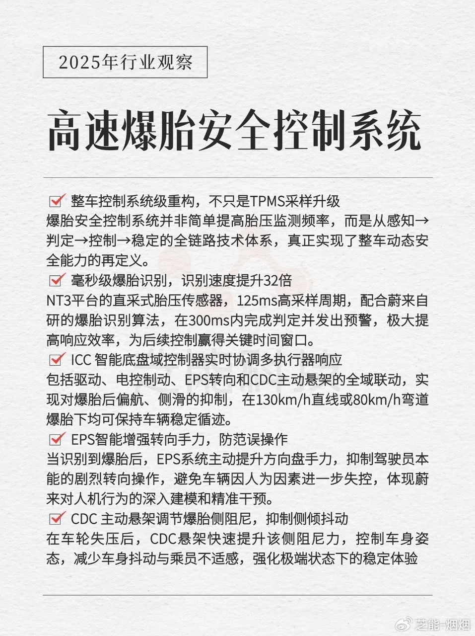 蔚来在高速爆胎控制领域的技术演进,并非简单在传统 TPMS 基础上升级采样频率,而是一次从感知到决策、再到执行的整车控制系统级重构。