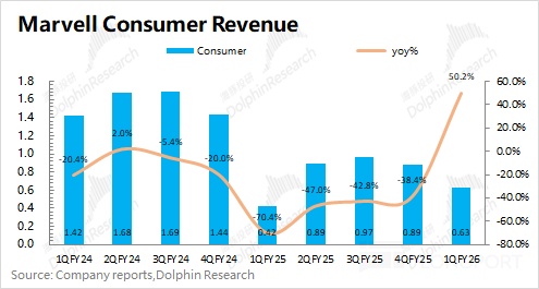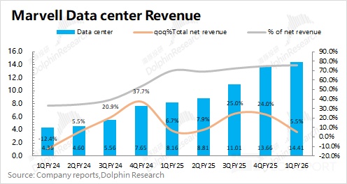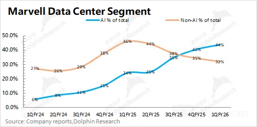 2. Data Center: Revenue of $1.44 billion, up 5.5% QoQ, fueled by AI demand. Data center now accounts for 76% of total revenue. Dolphin Research estimates $830 million in AI revenue this quarter, up $90 million QoQ, while non-AI segments saw slight declines.