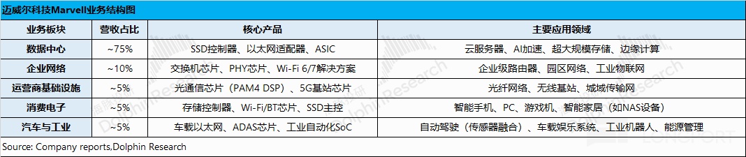 1) Data Center (75%): High-growth segment powered by ASIC demand. Includes SSD controllers, Ethernet switches (Innovium), and custom chips (AWS).
