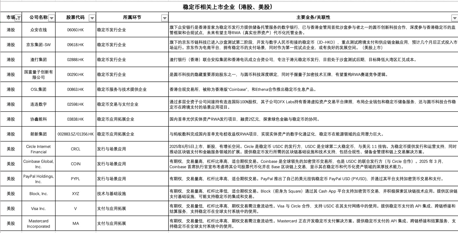 6. Listed Companies Related to Stablecoins (A-shares, Hong Kong stocks, U.S. stocks)