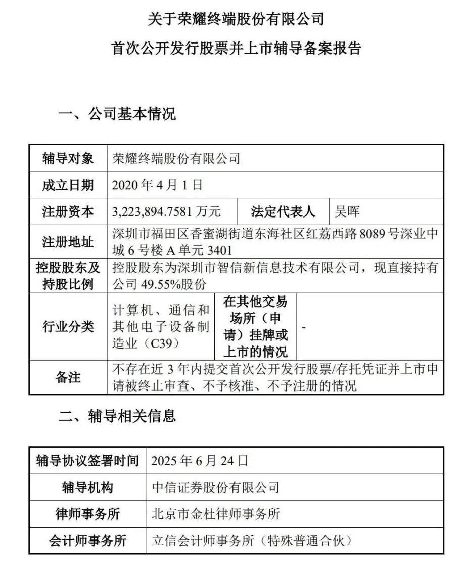 According to disclosures on the China Securities Regulatory Commission (CSRC) website, Honor Terminal Co., Ltd. has received IPO counseling approval, with CITIC Securities as the counseling institution. The counseling process is scheduled to be completed between January and March 2026.