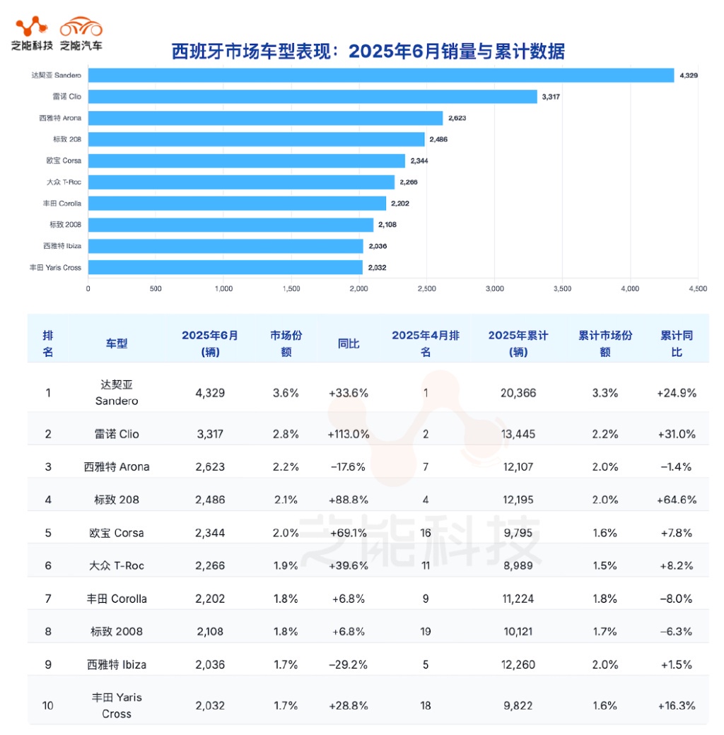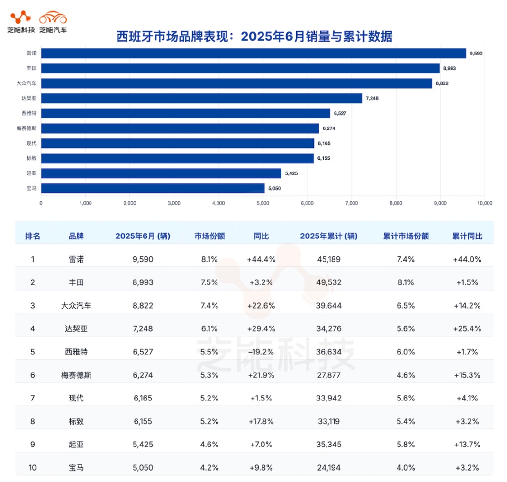 In June 2025, France's Renault and Dacia continued to dominate Spain's automotive market, while German and Japanese brands maintained steady growth. However, the more notable development was the comprehensive breakthrough of Chinese brands, leveraging systematic product strength, pricing advantages, and novelty. BYD and MG have entered the mainstream, while emerging players like Omoda, Jetour, Leapmotor, and XPeng are accelerating their expansion.