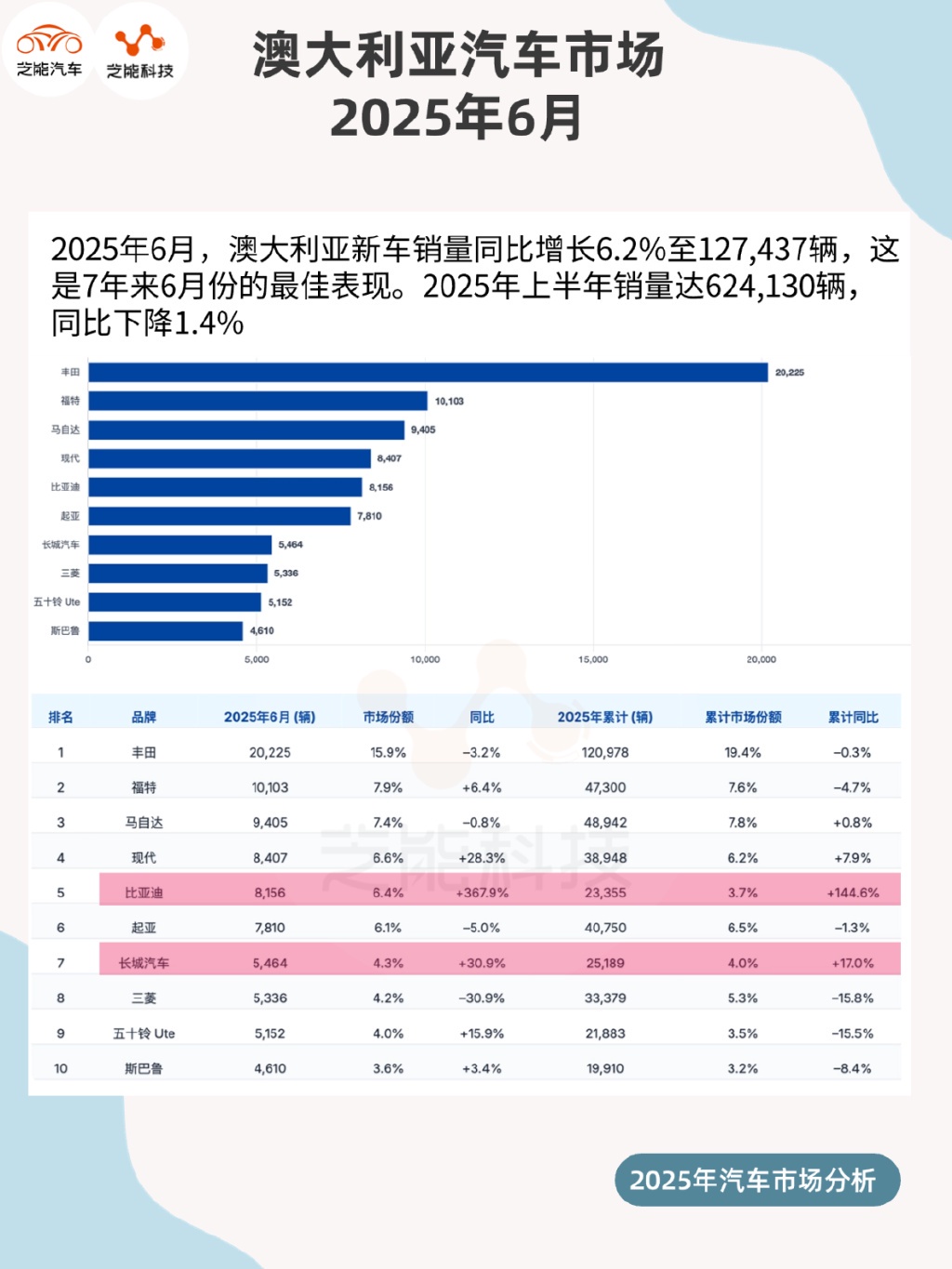 In June 2025, the Australian automotive market achieved year-on-year growth for the second consecutive month, with total sales reaching 127,437 units, a 6.2% increase, setting a seven-year high for the same period.