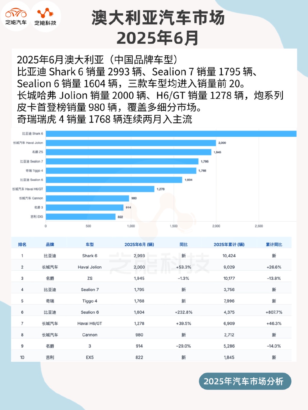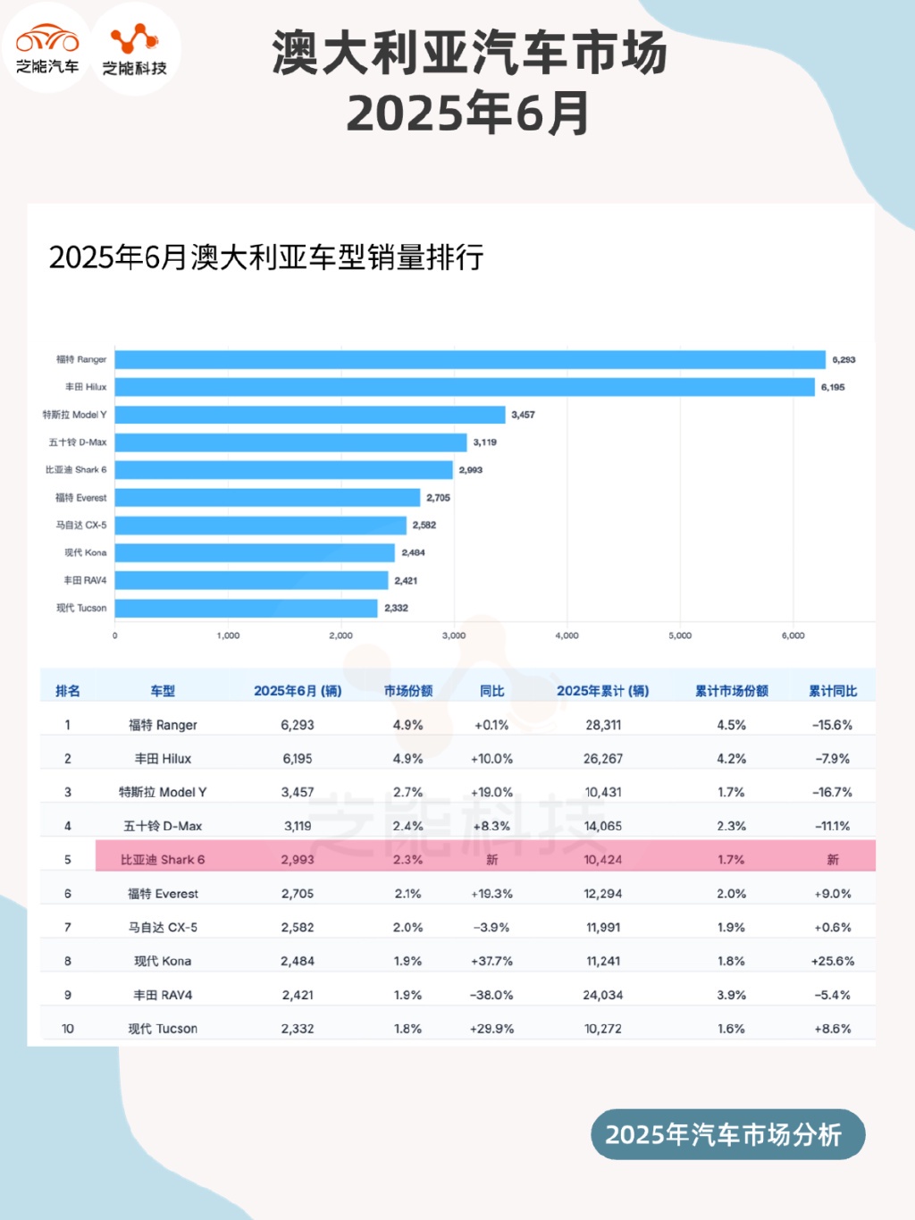 June 2025 in Australia showed two trends: traditional market share shifting to emerging brands, and accelerated electrification. Chinese brands are expanding their presence through product diversity, localization, cost advantages, and technology integration.