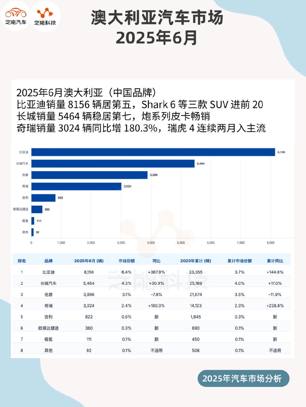 In June 2025, Chinese car brands performed strongly in Australia, with overall sales up 60.5% year-on-year and achieving historic breakthroughs in brand and model rankings. BYD's June sales reached 8,156 units, ranking fifth, its best performance in Australia.
