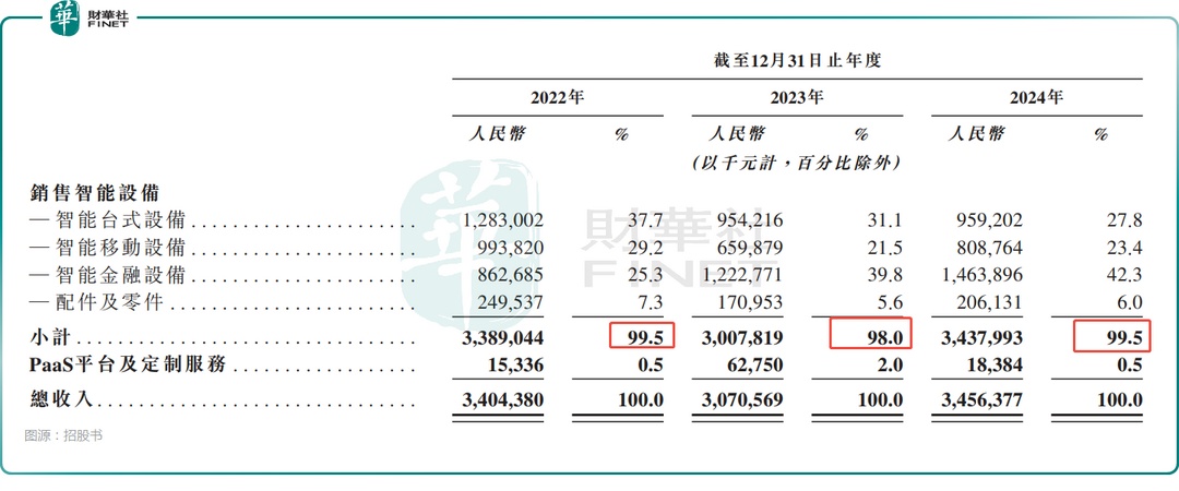 However, in terms of revenue structure, from 2022 to 2024, revenue from smart device sales accounted for 99.5%, 98.0%, and 99.5% of total revenue, respectively. In 2024, revenue from smart financial devices accounted for 42.3% of total revenue.