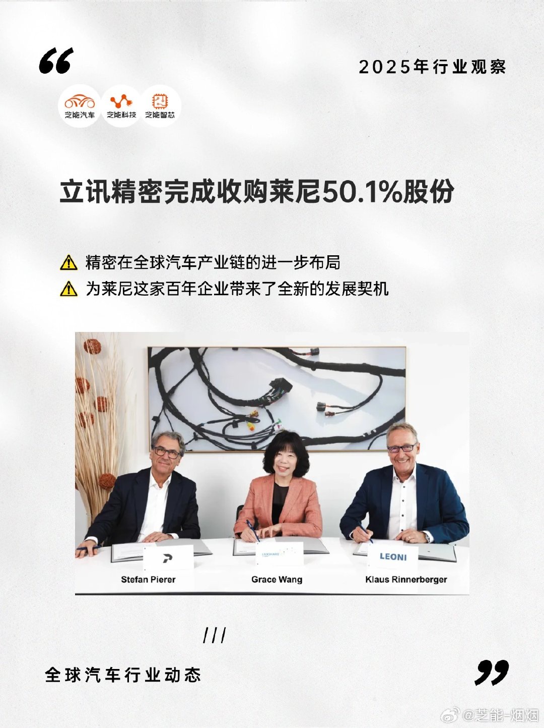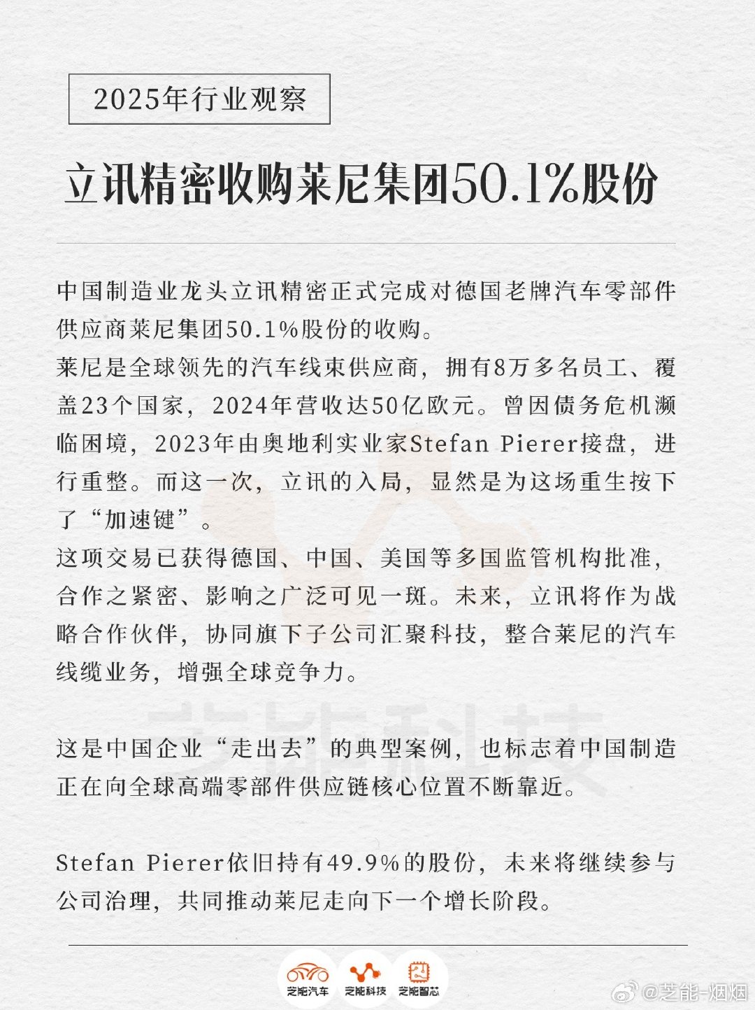 China's manufacturing leader Luxshare Precision has officially completed the acquisition of a 50.1% stake in Germany's long-established automotive parts supplier Leoni AG! Leoni is a globally leading automotive wiring harness supplier, with over 80,000 employees across 23 countries and revenue of 5 billion euros in 2024. It was on the brink of collapse due to a debt crisis in 2023 before being taken over by Austrian industrialist Stefan Pierer for restructuring. This time, Luxshare's entry has clearly pressed the 'accelerator button' for this rebirth. The transaction has been approved by regulatory authorities in Germany, China, the U.S., and other countries, demonstrating the depth and breadth of the collaboration. In the future, Luxshare will serve as a strategic partner, working with its subsidiary Huizhou Technology to integrate Leoni's automotive cable business and enhance global competitiveness. Stefan Pierer still holds a 49.9% stake and will continue to participate in corporate governance, jointly driving Leoni toward its next growth phase.