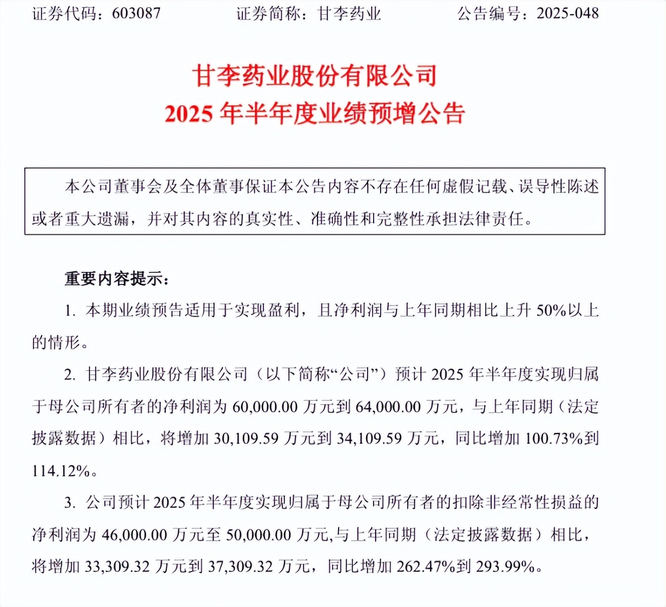 Recently, Gan & Lee Pharmaceuticals also released a pre-announcement of its 2025 semi-annual performance growth. The announcement shows that the company expects to achieve a net profit of 600 million to 640 million yuan in the first half of this year, a year-on-year increase of 100.73% to 114.12%; non-GAAP net profit is expected to be 460 million to 500 million yuan, a significant year-on-year increase of 262.47% to 293.99%.