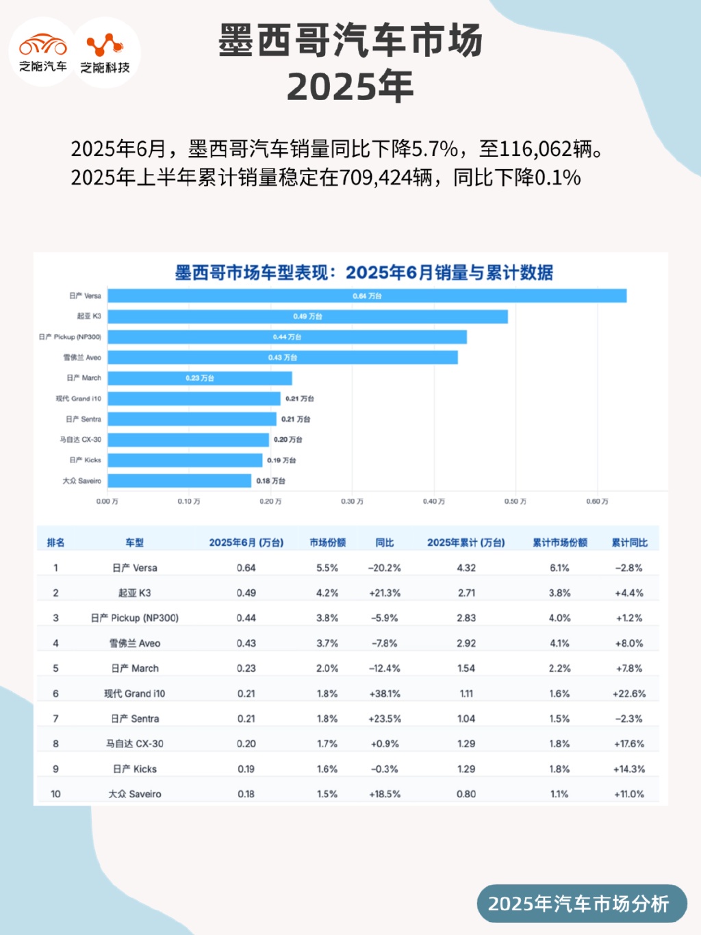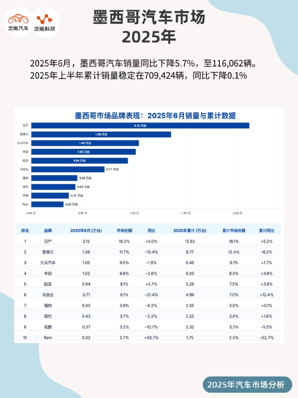 In June 2025, the Mexican light vehicle market sales fell by 5.7% year-on-year to 116,062 units, with the overall market performance under pressure.
