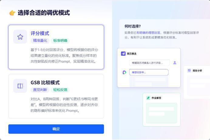 PromptPilot offers two optimization modes: Scoring Mode and GSB Comparison Mode. Scoring Mode is like "short-answer questions," requiring users to fill in scores, comments (optional), and ideal answers (optional). GSB Comparison Mode is more like "multiple-choice," where users compare answers and judge them as Good, Same, or Bad.