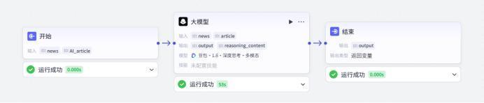 The workflow structure is simple: the start node takes two parameters—news (original news) and article (AI-generated article).