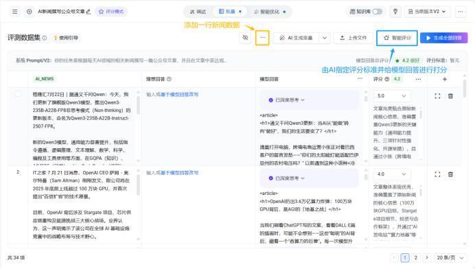 After completing these settings, click "Save and Generate Model Response." The platform will call the selected model to write the article based on the given prompt. After generation, click "Add to Evaluation Set."