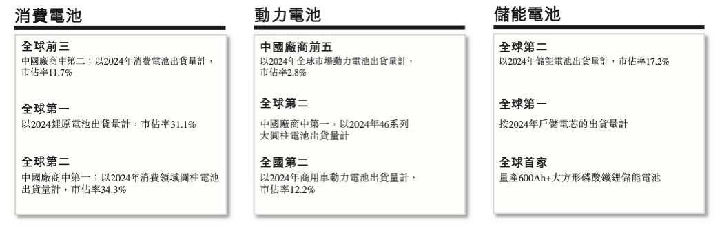 Diverse Business Layout: A leader in consumer batteries, power batteries, and energy storage batteries. In 2024, the company ranked first globally in lithium primary battery shipments (31.1% market share), second in energy storage batteries (17.2% market share), and first in China for 46-series large cylindrical power battery shipments. This diversified product mix enhances market coverage and resilience to industry fluctuations.
