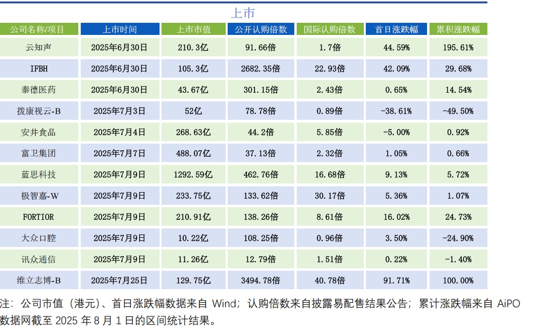 On June 30, 2025, three companies—Unisound, IFBH, and Taide Pharmaceutical—were listed on the Hong Kong Stock Exchange. In July, nine companies, including Bocom-Rimes and Anjoy Food, made their debut on the Hong Kong Stock Exchange. The performance of these new listings is as follows: