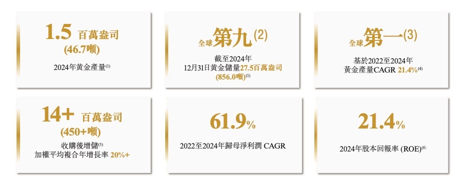 High Growth and Cost Advantages: From 2022 to 2024, gold production CAGR was 21.4%, and net profit attributable to the parent company CAGR was 61.9%, leading global peers. From 2019 to 2024, the average acquisition cost per ounce of mines was $61.3, 52% lower than the industry average, with some mines turning profitable within 1-2 years after acquisition.