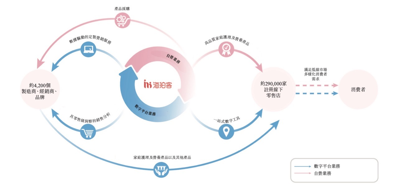 Specifically, since 2015, Haipaike has operated a digital platform connecting approximately 4,200 upstream manufacturers and brands with about 290,000 registered offline retail stores, building a transaction network for household care and nutrition products covering China's lower-tier markets. The business comprises three segments: (1) matching buyers and sellers through the "Haipaike Platform" and charging commissions based on transaction volume; (2) self-operated business launched in 2019, independently procuring popular fast-moving consumer goods (FMCG) and selling them on the platform, serving about 100,000 paying buyers in 2024 with over 1,000 SKUs; and (3) proprietary brand business launched in 2021, developing OEM products based on platform data and market demand, incubating 92 brands in 2024, partnering with 153 manufacturers, serving over 38,000 buyers, and offering over 1,000 SKUs, creating a differentiated product matrix and closed-loop supply chain.