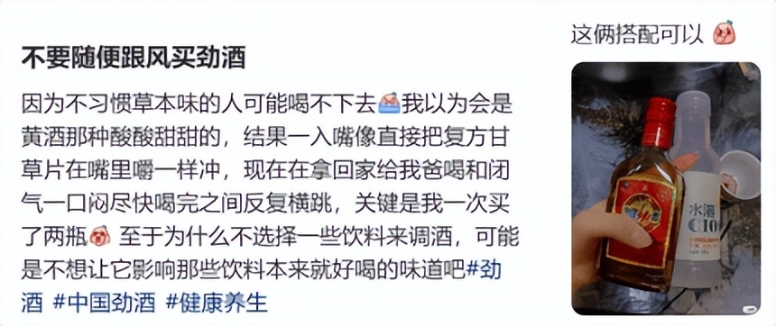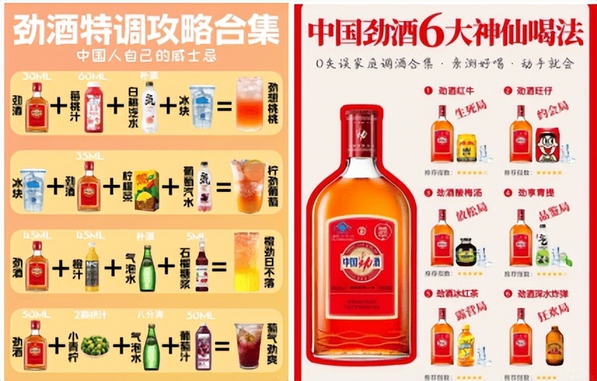 In addition to the classic advertising slogan "Jinjiu is good, but don't drink too much", new scene associations such as "drinking during women's physiological period" have been derived; in response to the evaluation of "too strong medicinal taste", the mixed drinking method spontaneously created by young people has given the brand a new interpretation of "China's own whiskey".