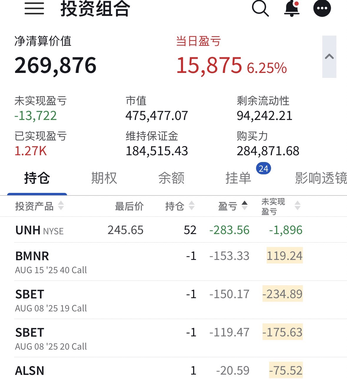 First, let's look at A-shares. A-shares have stabilized above 3600, but given the current situation, I'm not optimistic about a long-term bull market. At this level, buying A-shares doesn't offer good value for money. Actions: Liquidated Angel Yeast, liquidated Zhongbei Communications, liquidated COSCO SHIPPING Energy, and liquidated most of Shandong Gold International. The low volatility of A-shares doesn't suit my current trading style. I plan to transfer funds from A-shares to U.S. stocks, which will take about three days. Taking advantage of today's rebound, I liquidated some positions. UnitedHealth is still underperforming, and the two Ethereum call options I sold also suffered heavy losses. U.S. stocks are strong, but it's unclear whether this can continue...