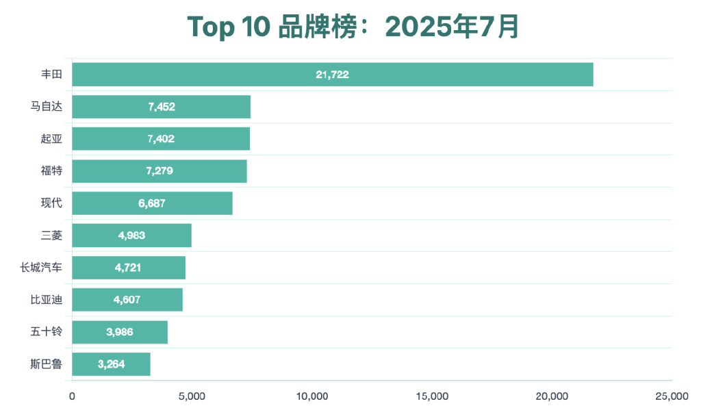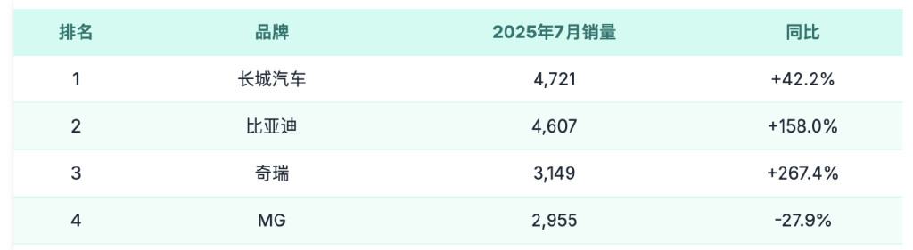◎ Among Chinese brands, Great Wall Motors is the most stable performer. Its July sales reached 4,721 units, a year-on-year increase of 42.2%, ranking seventh among all brands in Australia and the most popular Chinese car brand.