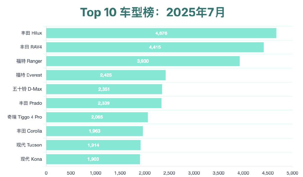 ◎ The Toyota Hilux, RAV4, and Ford Ranger still occupy the top three positions.