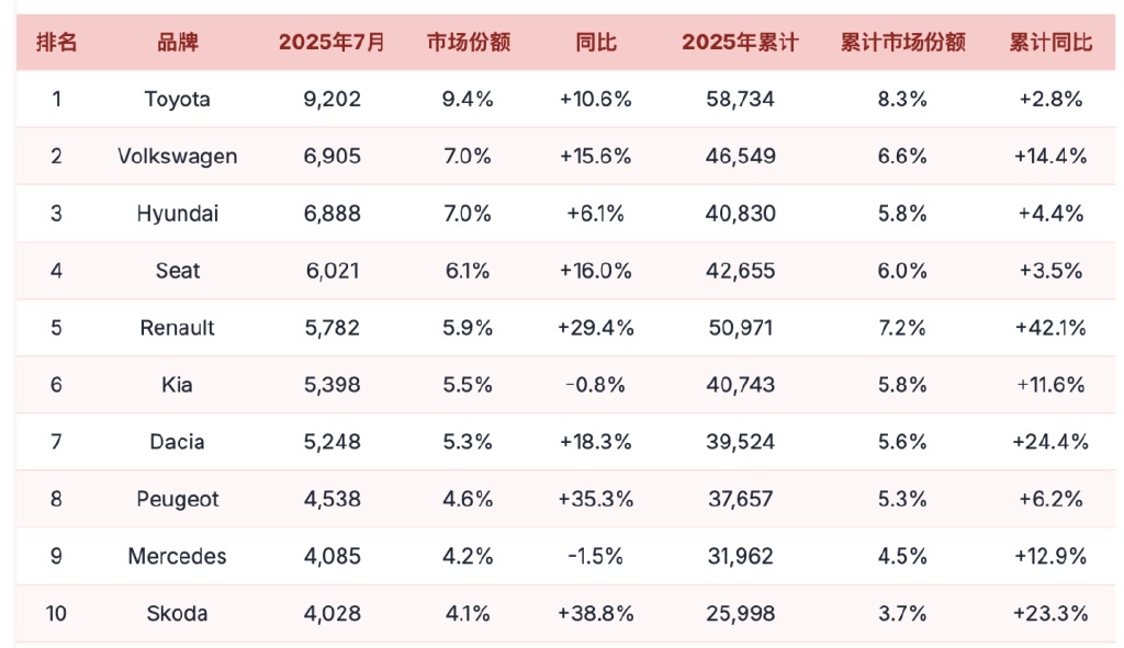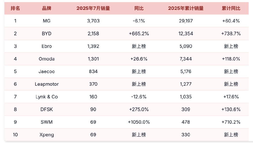 ◎ In July 2025, MG sold 3,703 units, ranking 12th with a market share of 3.8%. Year-to-date, MG has sold 29,197 units, a 60.4% increase year-on-year, rising to 10th place in overall brand sales rankings, making it one of the best-performing Chinese automakers in Spain.