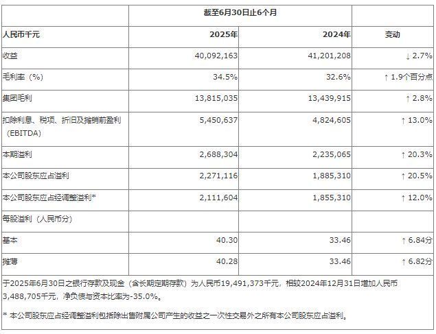 Tingyi (Cayman Islands) Holding Corp. (0322.HK, hereinafter referred to as the "Company", together with its subsidiaries, the "Group") announced its interim results for the first half of 2025. During this period, the Group keenly seized development opportunities, focused on the refined operation of its core businesses, continuously optimized cost structure and operational efficiency, and steadily advanced the process of high-quality development, achieving stable overall performance and continuous improvement in key financial indicators. For the six months ended June 30, 2025, the Group's revenue decreased by 2.7% year-on-year to RMB 40.092 billion. Among this, the instant noodle business contributed RMB 13.465 billion, while the beverage business contributed RMB 26.359 billion. The gross profit margin increased by 1.9 percentage points year-on-year to 34.5%, and EBITDA rose by 13.0% year-on-year to RMB 5.451 billion. Driven by the improved gross profit margin, the profit attributable to shareholders of the Company increased by 20.5% year-on-year to RMB 2.271 billion.