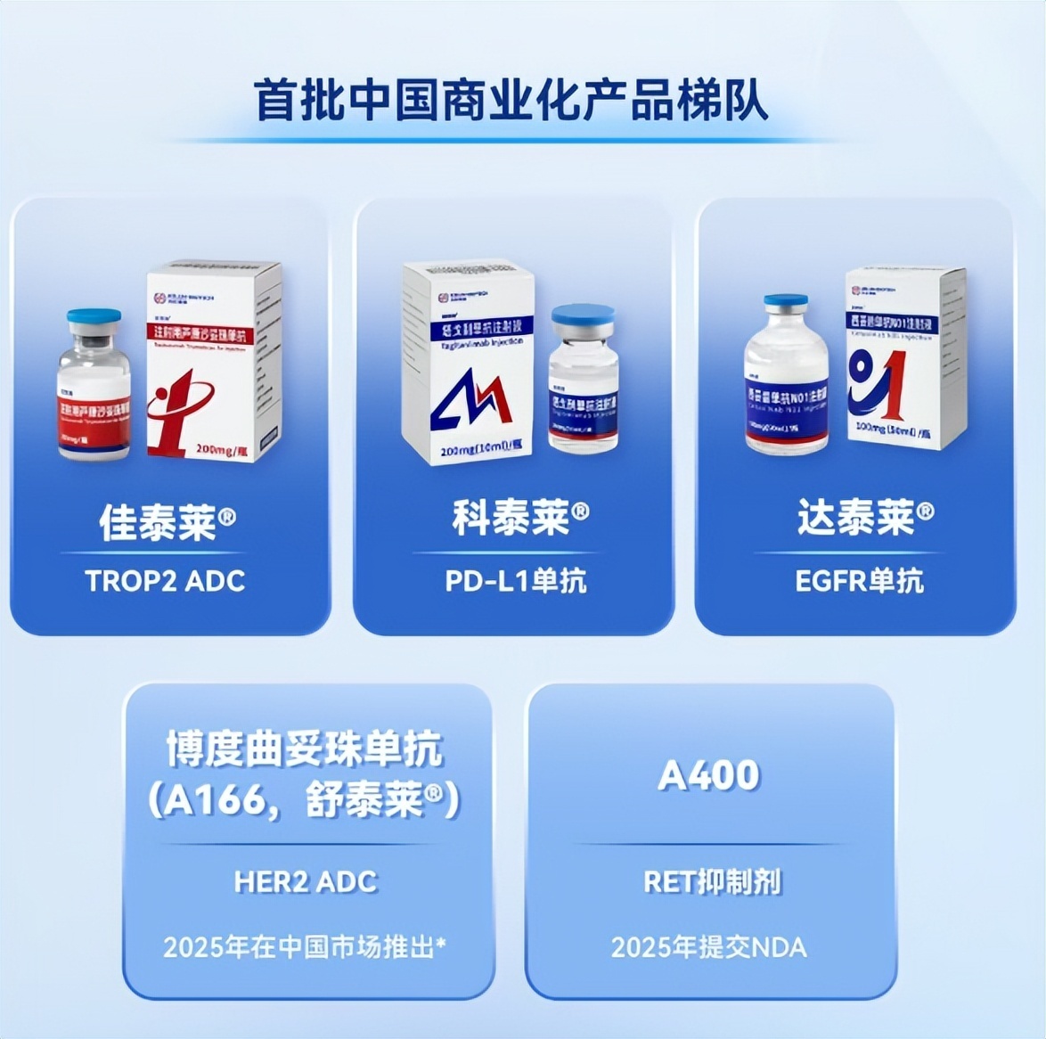 The financial report mentions that Kelun-Biotech has obtained marketing approvals for Sacituzumab Govitecan (Jiatailai®), Tagolizumab (Ketailai®), and Cetuximab N01 (Datailai®), and has begun commercializing these three products.