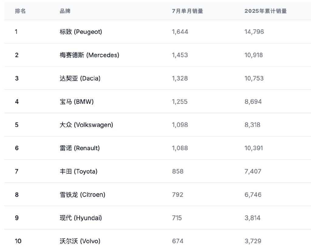 Behind the numbers is the combined effect of demand recovery and the transition to new energy. Peugeot and Mercedes-Benz still occupy the top two spots on the list, but their growth has slowed. Meanwhile, Citroën, and others have achieved explosive growth through new products and pricing advantages.