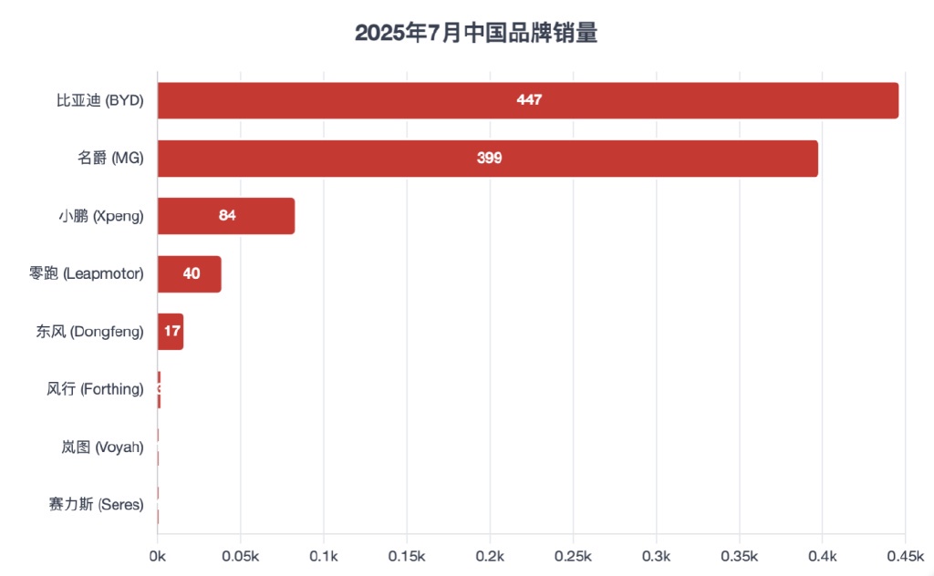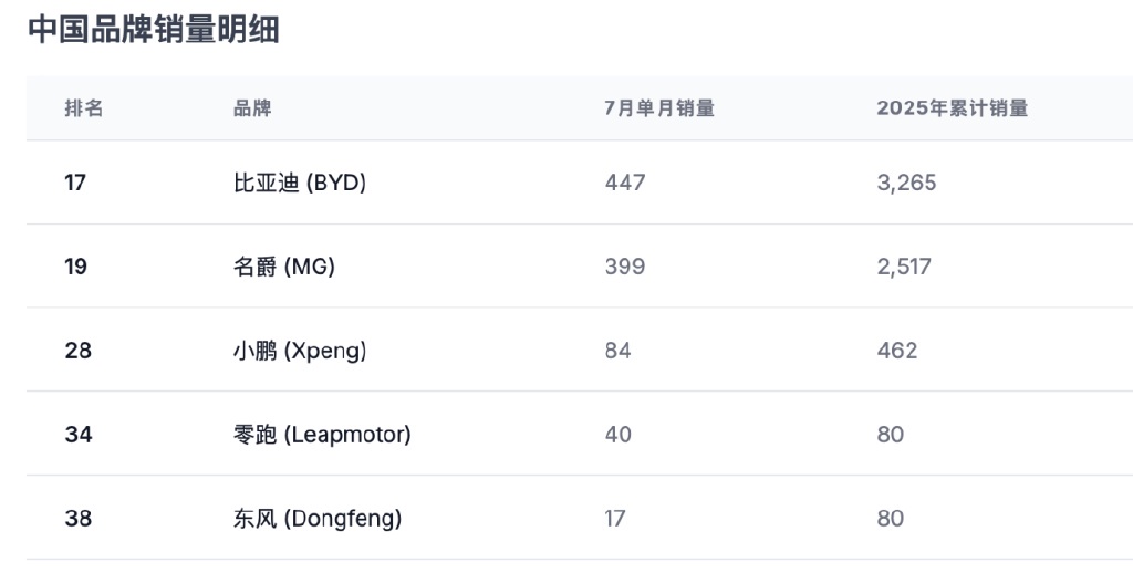 In July 2025, Chinese brands continued to show growth momentum in the Portuguese market, with BYD, MG, XPeng, Leapmotor, and others appearing on the sales charts.