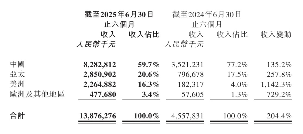 By region, domestic revenue was 8.28 billion yuan, up 135.2% year-on-year; the Asia-Pacific market (excluding China) generated 2.85 billion yuan, up 257.8%; the Americas performed most impressively, with revenue of 2.26 billion yuan, up 1,142.3%; Europe and other regions contributed 480 million yuan, up 729.2%.