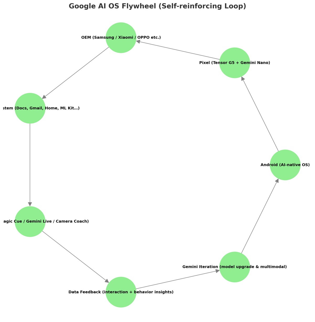 - Pixel validation → OEM adoption → device proliferation → user habit shifts → data feedback → Gemini iteration.