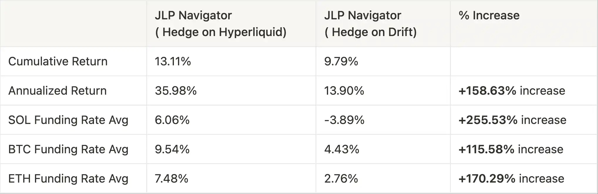 When Hyperliquid's funding rates are positive, these short positions generate additional returns, further boosting the vault's overall performance. Compared to Drift, migrating to Hyperliquid increased funding fee-driven annualized returns by +158.63%.