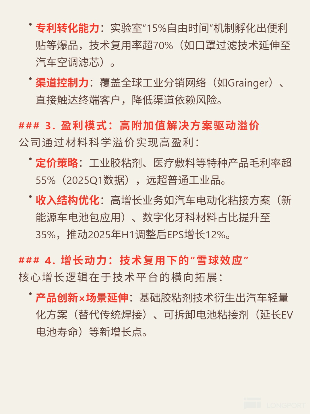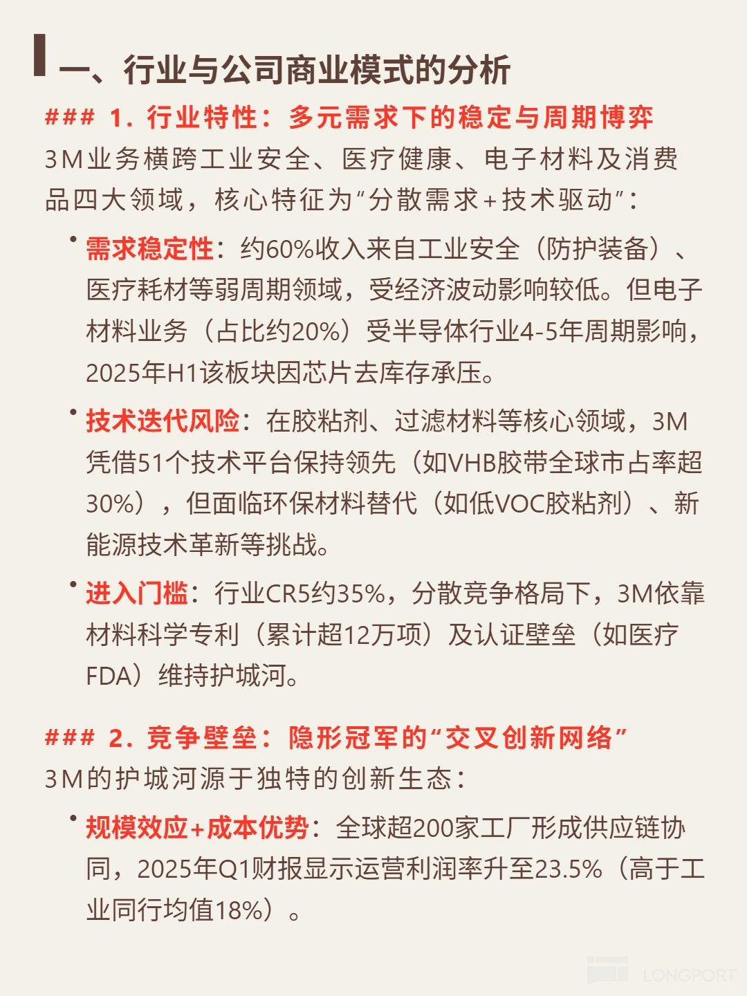 🎯 Core logic: 3M is a materials science solutions provider spanning industrial safety, healthcare, electronic materials, and consumer goods, with a business model centered on "dispersed demand + technology-driven." 60% of its revenue comes from weakly cyclical sectors such as industrial safety and medical consumables, demonstrating strong resistance to economic fluctuations; however, 20% of its electronic materials business is affected by the 4-5 year semiconductor cycle, facing pressure in H1 2025 due to chip destocking. Leveraging 51 technology platforms (e.g., VHB tape with a global market share exceeding 30%) and 120,000 patents, growth is driven by horizontal technology reuse (e.g., extending mask filtration technology to automotive filters), though its high-debt structure poses a major risk.