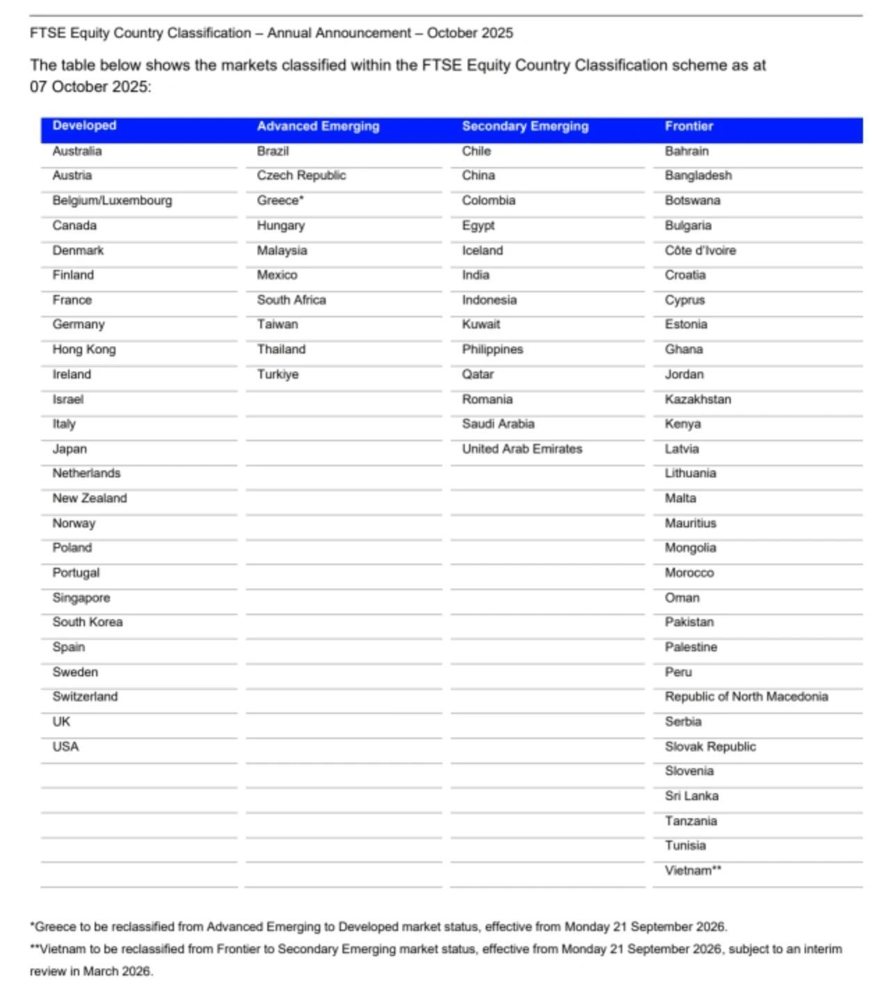 A few more points: According to FTSE Russell’s classification of national (regional) markets, they can be divided into three major categories and four subcategories: Developed Markets, Emerging Markets (further divided into Primary Emerging Markets and Secondary Emerging Markets), and Frontier Markets. Alongside this announcement, there were also rating changes for markets in other countries. The full version can be viewed on our platform.