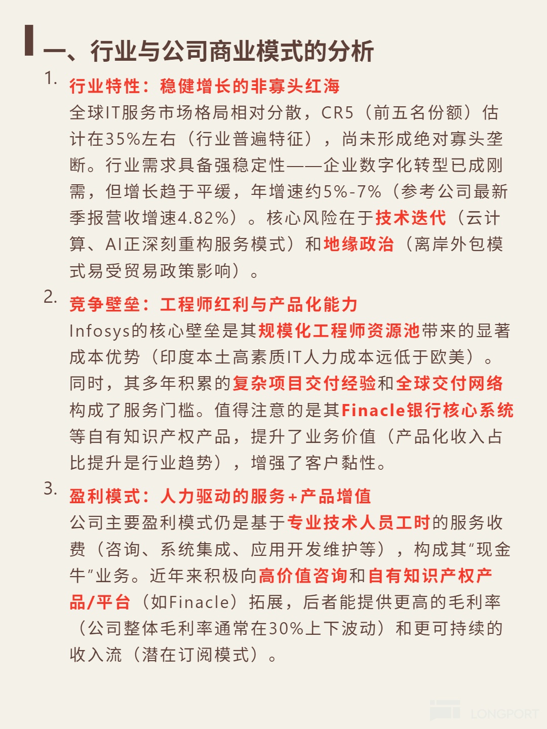 $Infosys(INFY.US) After researching Infosys, the key finding is: This global IT services leader has built sustainable competitiveness in a fragmented but stable industry, leveraging its engineer dividend and robust financials.