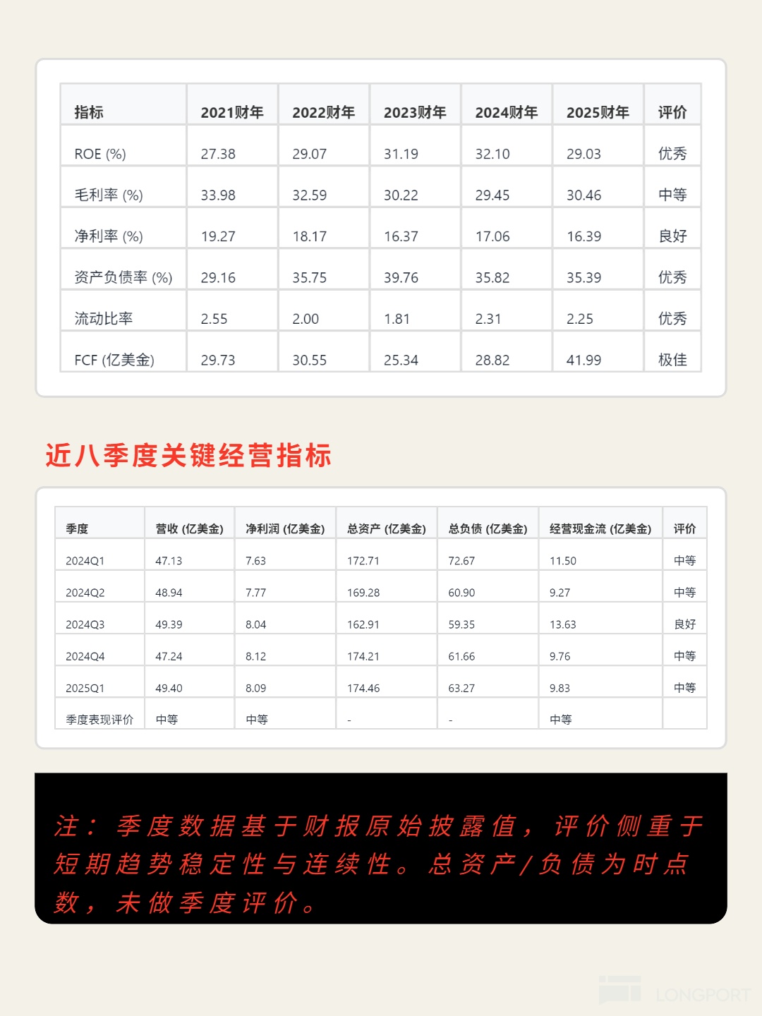 📈 Financial highlights: ROE consistently 27%-32% for five years (FY2025: 29.03%), outstanding shareholder returns. Gross margin dipped from 33.98% to 30.46% (FY2025) but remains above peers; net margin stable at 16%+ (FY2025: 16.39%) with strong cost control. Ultra-sound financial structure: Debt-to-equity 35.39% (<40%), current ratio 2.25 (>2.0), cash reserves $3.2B. Ample FCF at $4.2B in FY2025 (130% of net profit), cash conversion ratio 1.4x, high earnings. Growth stabilizing: FY2025 revenue/net profit up 3.88%/5.98%, FY2026Q1 revenue +4.82%, entering steady-growth phase.