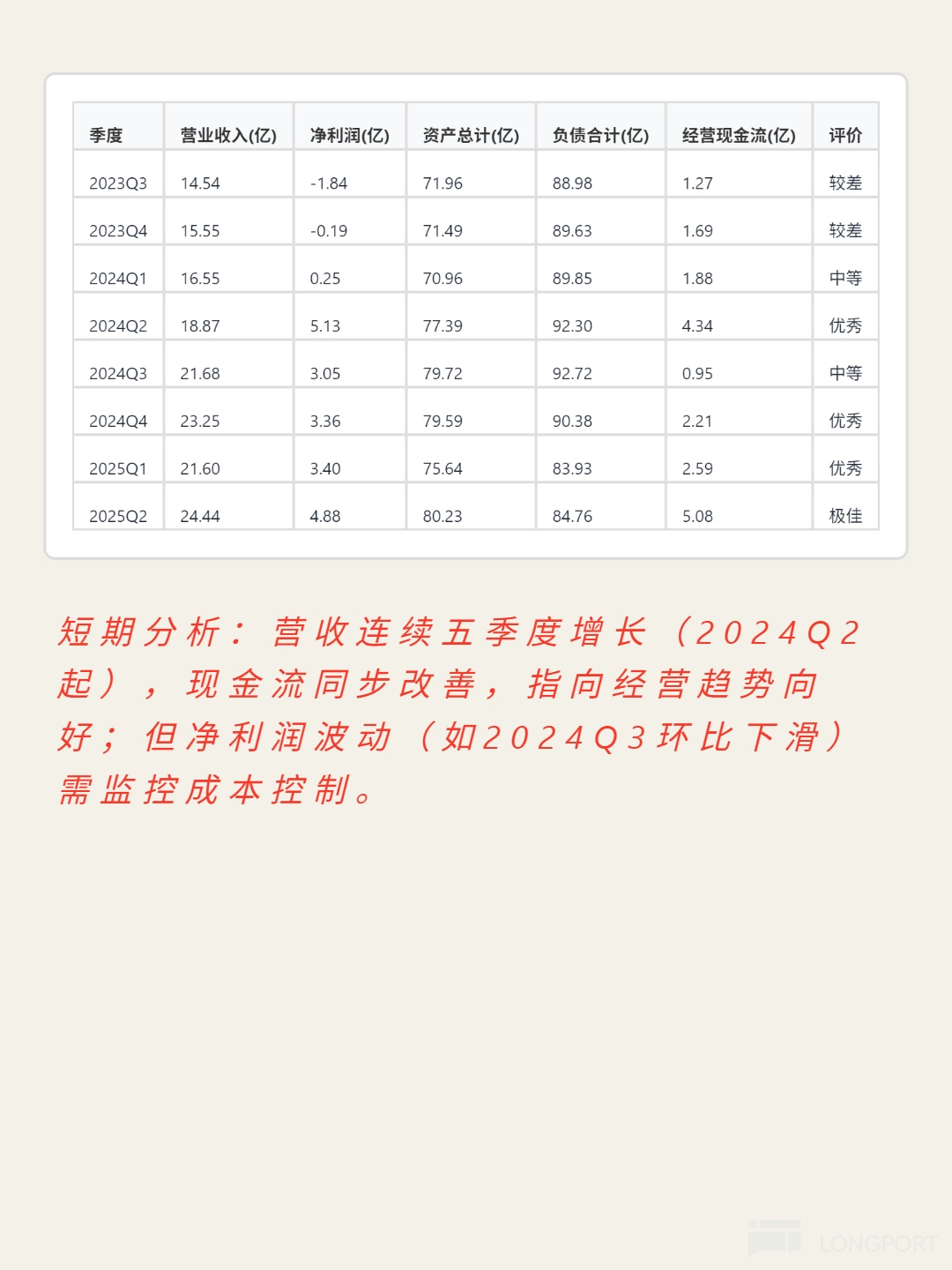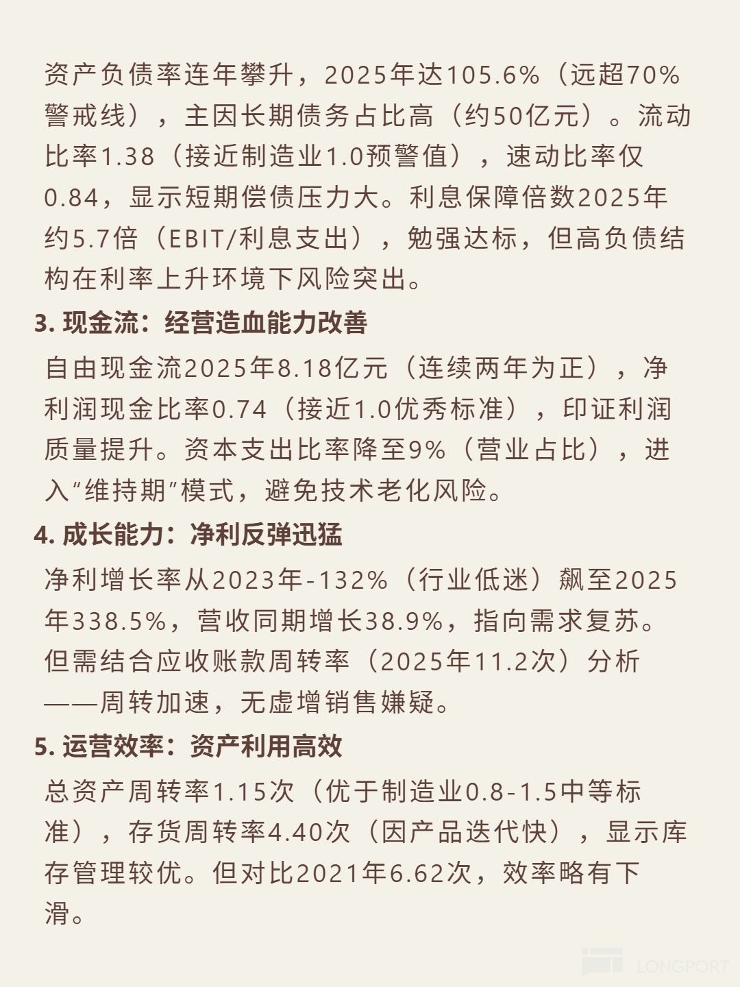 📈 Financial highlights: FY2025 gross margin 35.2%, net margin 16.1% rebounded significantly, net profit up 338.5% YoY, revenue up 38.9%. However, the debt-to-asset ratio is 105.6% (long-term debt ~$5B), current ratio 1.38, quick ratio 0.84, indicating short-term debt pressure. Free cash flow $818M (positive for two years), net profit cash ratio 0.74, profit quality improved. Revenue grew for five consecutive quarters, 2025Q2 net profit $488M (best quarter), but ROE -151.1% shows high debt drags shareholder returns.