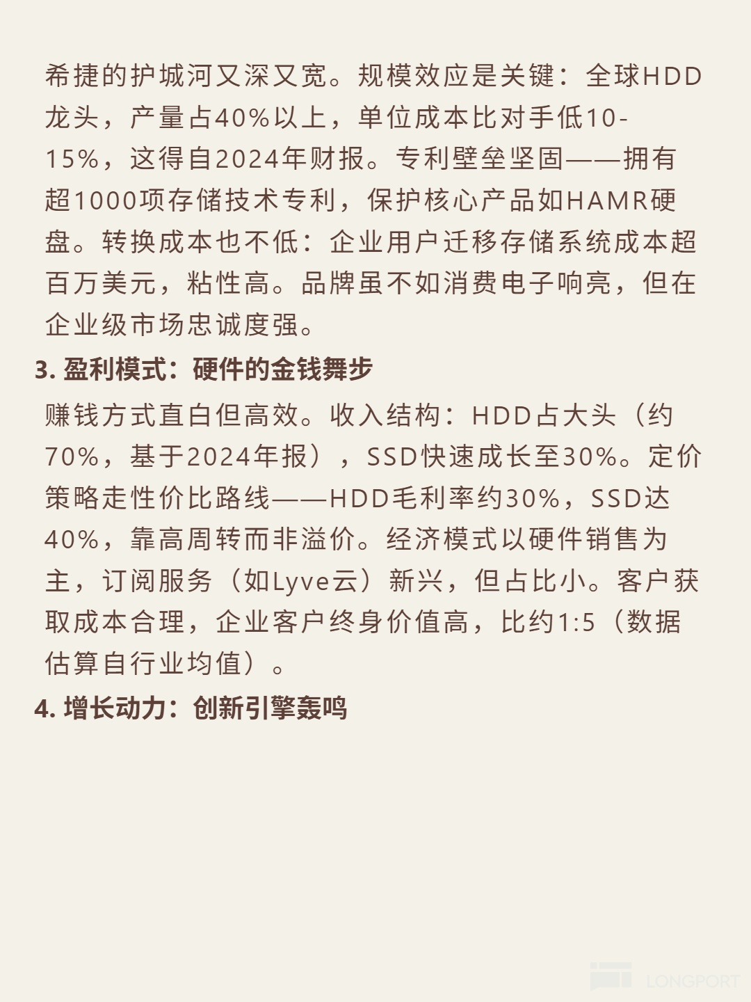 🎯 Core logic: The HDD industry has an oligopoly structure with CR3 over 90% (Seagate, Western Digital, Toshiba), with stable pricing power but obvious cyclicality (4-5 year fluctuations). HDD still dominates in high-capacity storage (data centers). Competitive barriers come from economies of scale (40%+ production share, 10-15% lower unit costs than competitors), 1000+ storage technology patents (e.g., HAMR hard drives), and high switching costs for enterprise customers (migration costs exceed millions of dollars). Profits mainly come from HDD (70% of revenue), with SSD accounting for 30%. HDD gross margin is 30%, SSD 40%, relying on high turnover for profitability. Growth drivers are HAMR technology (capacity increased to 30TB+, new product revenue up 15% YoY) and cloud storage demand (enterprise demand up 20% YoY).