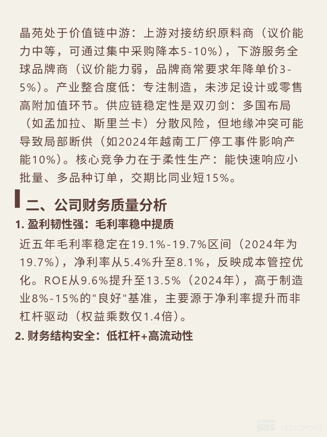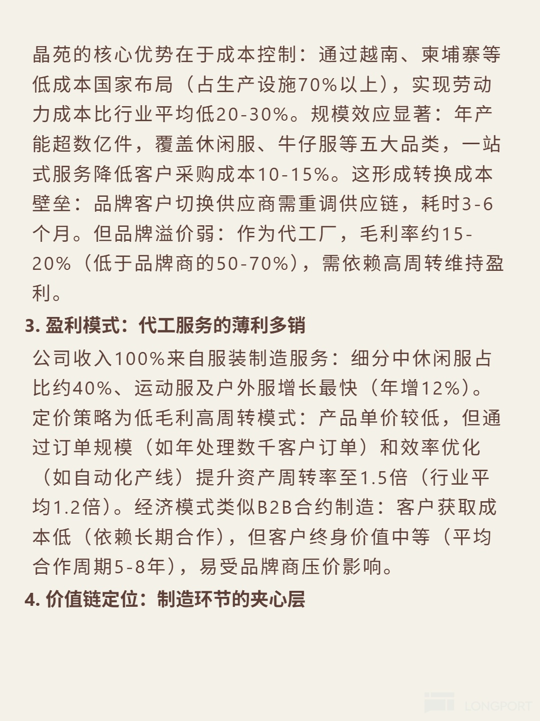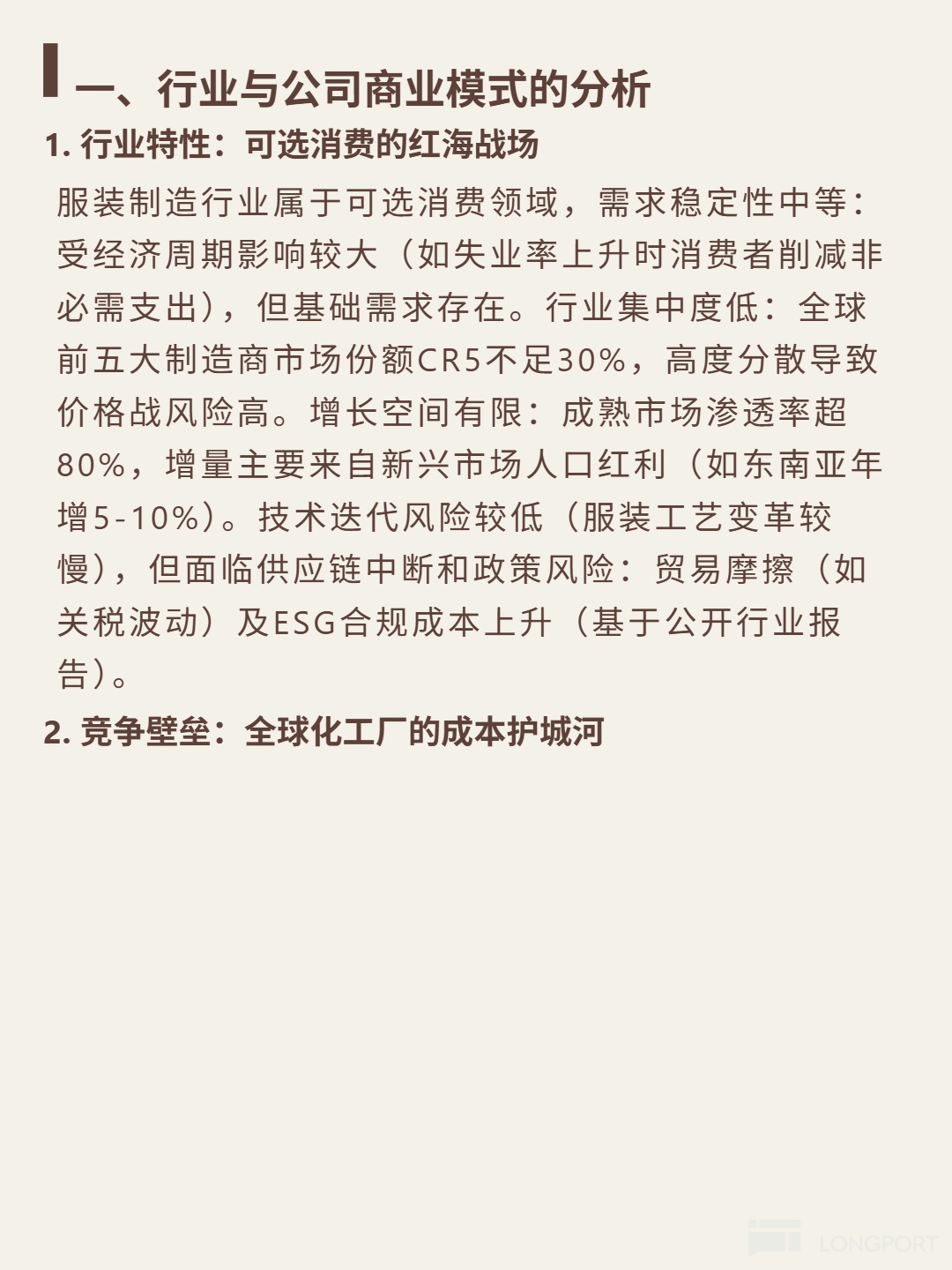 🎯 Core logic: Global garment OEMs rely on low costs and economies of scale. The industry is discretionary consumption, demand is cyclical, concentration is low (CR5 <30%), growth depends on emerging markets (Southeast Asia grows 5-10% annually). The company has a presence in Vietnam and Cambodia (70%+ of capacity), labor costs are 20-30% lower than the industry, annual capacity is hundreds of millions of pieces, one-stop service reduces customer costs by 10-15%, forming switching cost barriers. The profit model is high volume with thin margins, 100% revenue from OEM, casual wear accounts for 40%, sportswear grows fastest (12% annual growth), gross margin 15-20%, profits rely on high turnover (asset turnover 1.5x).