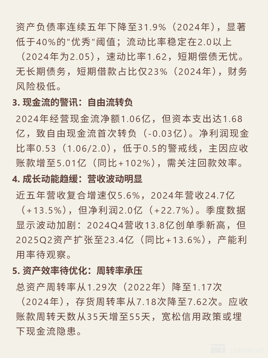 📈 Financial highlights: 2024 gross margin 19.7% (stable 19.1-19.7% over five years), ROE 13.5% (above manufacturing benchmark of 8-15%). Safe financial structure, debt-to-asset ratio 31.9% (below 40% threshold), current ratio 2.05, no long-term debt. But cash flow pressure: 2024 free cash flow turned negative for the first time (-3 million), net profit cash ratio 0.53 (below 0.5 warning line), accounts receivable 501 million (+102% YoY), turnover days increased to 55 days. Revenue growth slowed, 5-year CAGR 5.6%, 2024 revenue 2.47 billion (+13.5%), net profit 200 million (+22.7%), but asset turnover fell to 1.17x, capacity utilization to be observed.
