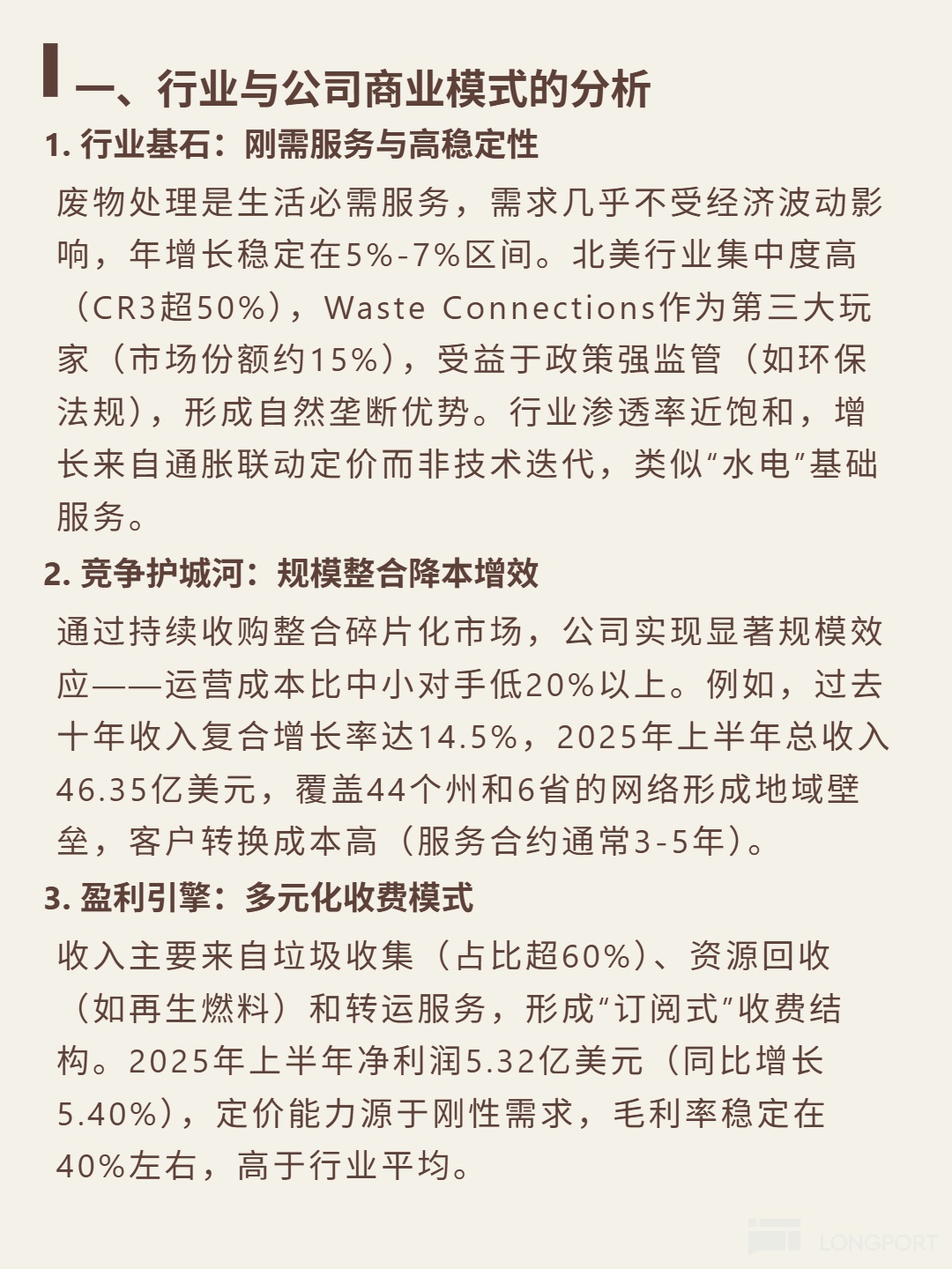 🎯 Core logic: Waste management is an essential service, with annual demand growth of 5%-7% unaffected by economic fluctuations, similar to the stability of "utilities." The company consolidates a fragmented market through continuous acquisitions (covering 44 U.S. states and 6 Canadian provinces), with operating costs 20%+ lower than smaller competitors, high customer switching costs (3-5-year contracts), and strong regulatory policies creating a natural monopoly, holding ~15% market share. Revenue primarily comes from waste collection (>60%) and recycling, with a stable subscription-based fee model.