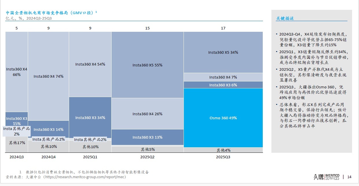 The market landscape of panoramic cameras has also seen intense changes. DJI entered this field on July 31 this year. In less than three months, its first panoramic camera, the Osmo 360, leveraged cross-platform applications and a high cost-performance ratio to secure 49% of the market share in Chinese e-commerce channels and 43% globally. This has accelerated the restructuring of the global panoramic camera market.