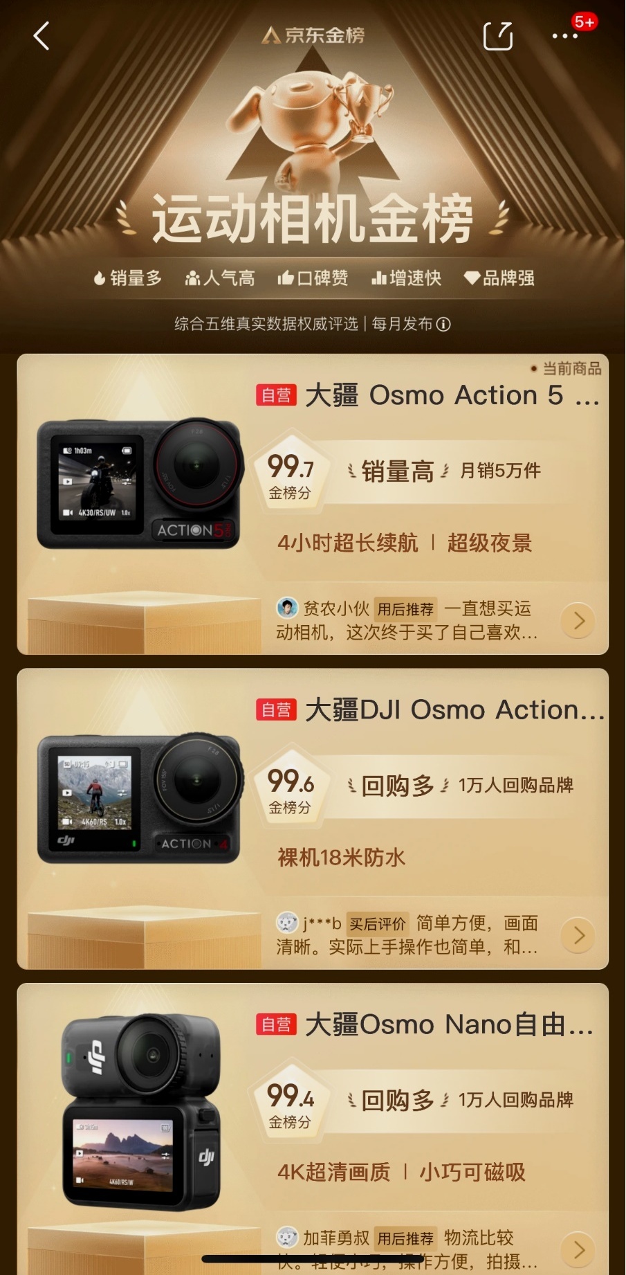 Recently, JD.com's "Action Camera Gold List" was released, further confirming that the entire action camera market has fully entered the "DJI era." DJI's Osmo Action 5 Pro, Osmo Nano, and Osmo Action 4 directly claimed the top three spots on the Gold List.