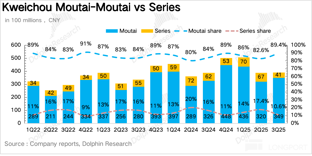 3. Series liquor declined severely. In 3Q25, series liquor achieved revenue of 4.1 billion yuan, a year-on-year decrease of 33.7%. In the context of comprehensive price inversion, high channel inventory, and sluggish demand, Dolphin Research speculates that the company basically abandoned the strategy of pushing goods to distributors to achieve growth in the third quarter to alleviate channel burdens.