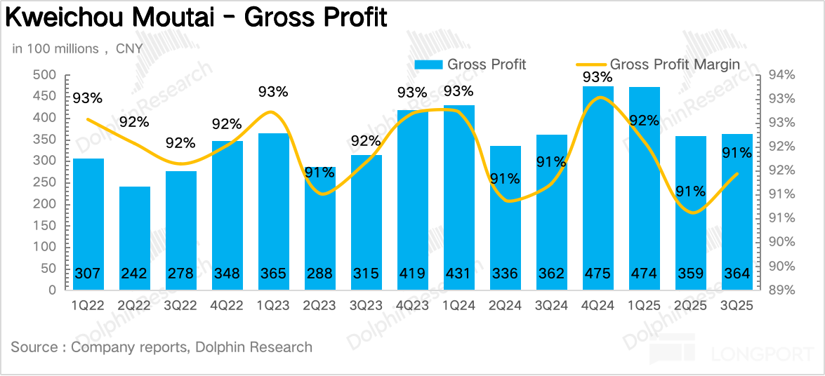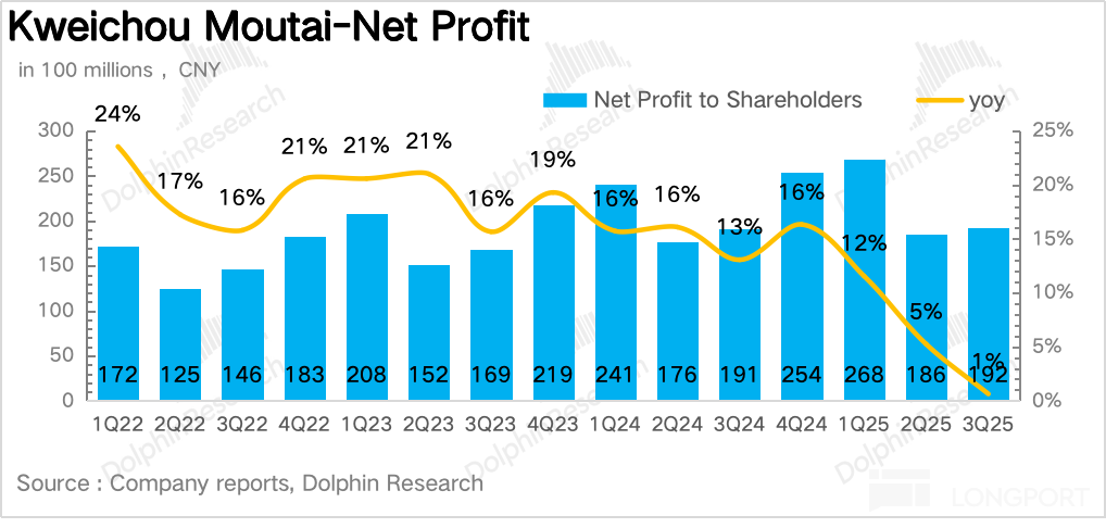 In fact, the continued slowdown in third-quarter performance could already be predicted from the sharp decline in contract liabilities in the second quarter (down 45% year-on-year), so Dolphin Research was not overly surprised. Therefore, market expectations are not very meaningful overall. In 3Q25, Moutai achieved a net profit attributable to the parent company of 19.22 billion yuan, a year-on-year increase of 0.6%, slightly faster than revenue growth.