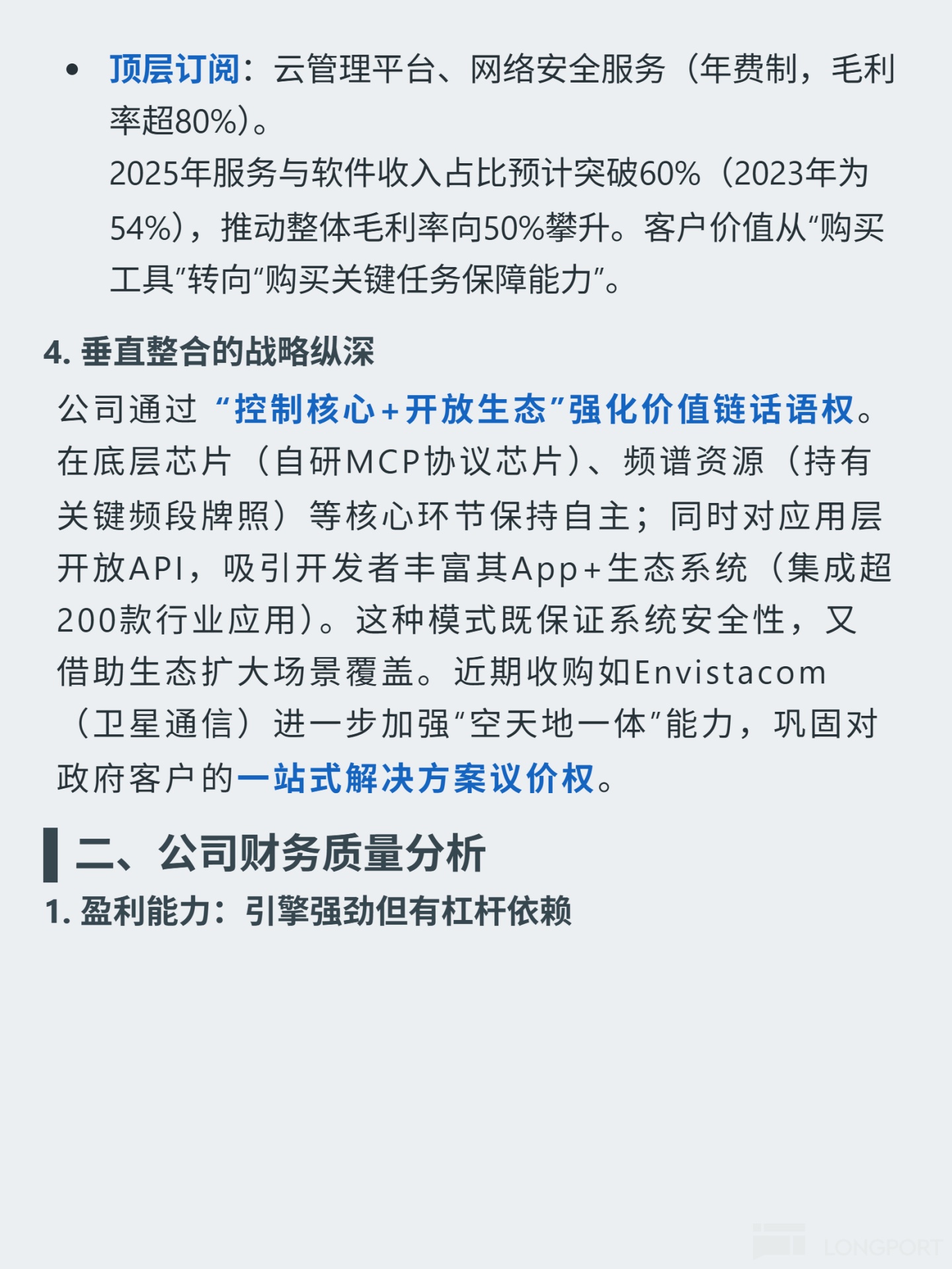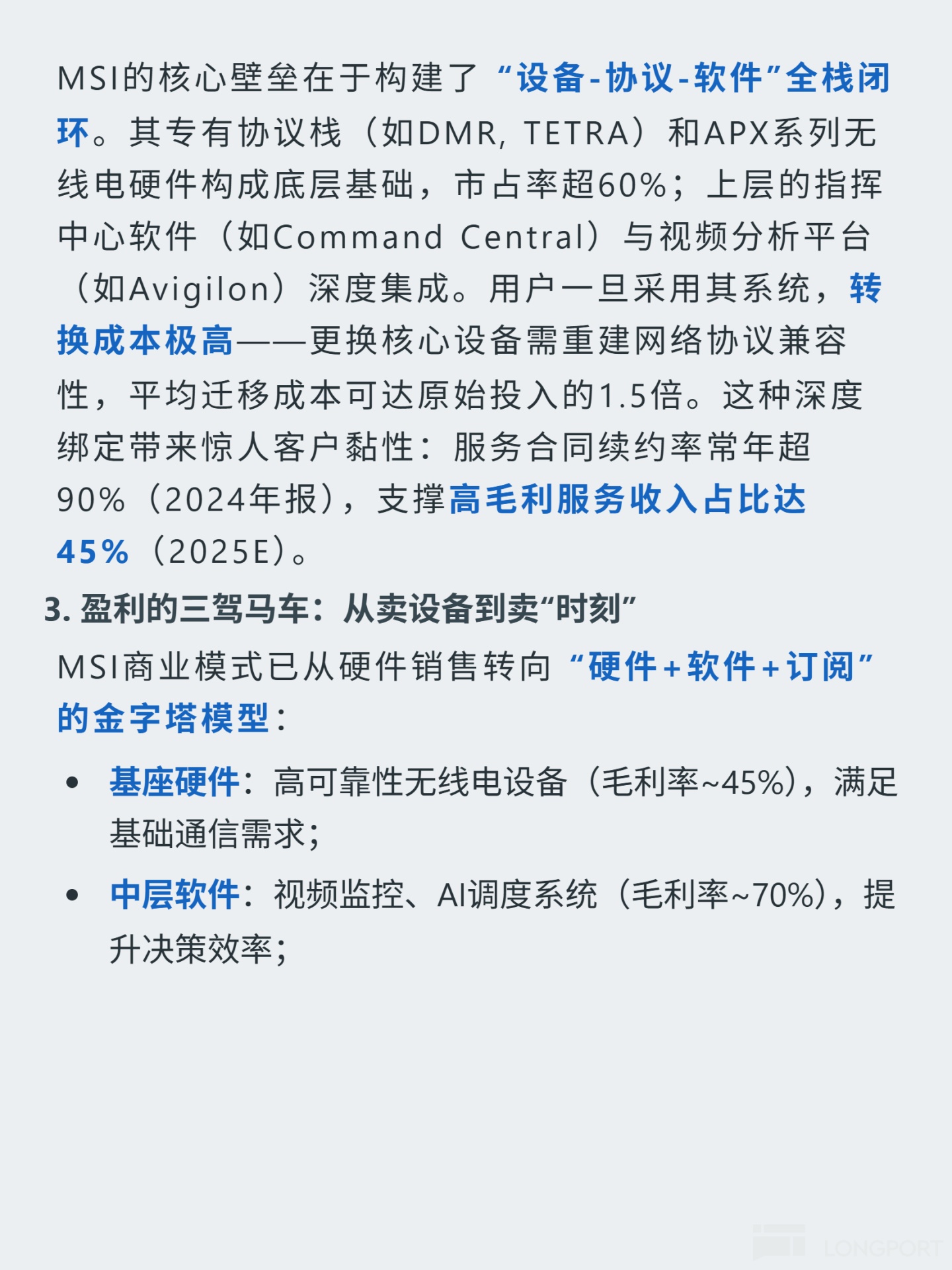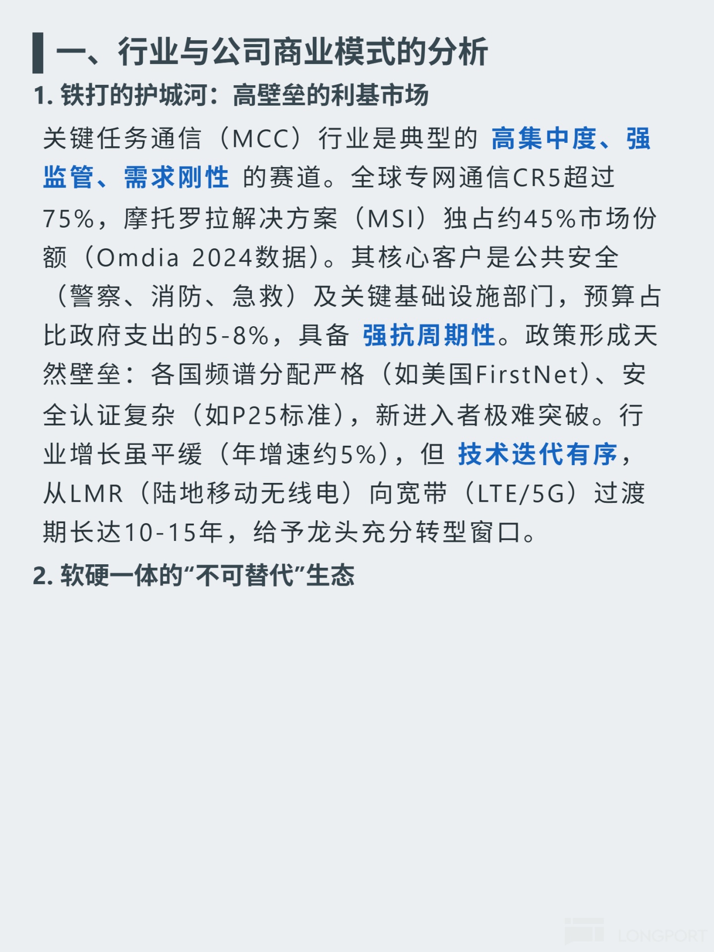 🎯 Core Thesis: MCC is a highly concentrated (CR5 >75%), heavily regulated, and demand-inelastic sector where MSI holds 45% global market share. Clients include public safety (police, fire) and critical infrastructure sectors, with budgets accounting for 5-8% of government spending, demonstrating strong cyclical resilience. The company has built a "hardware-protocol-software" full-stack 闭环: Proprietary protocols (DMR, TETRA) and APX radio hardware hold >60% market share, while integrated command center software (Command Central) and video analytics (Avigilon) create switching costs at 1.5x initial investment, with >90% service contract renewal rates. Through in-house MCP protocol chips, strategic spectrum licensing, open APIs (200+ integrated apps), and the Envistacom acquisition for "air-space-ground" integration, it solidifies pricing power as a one-stop solution provider.