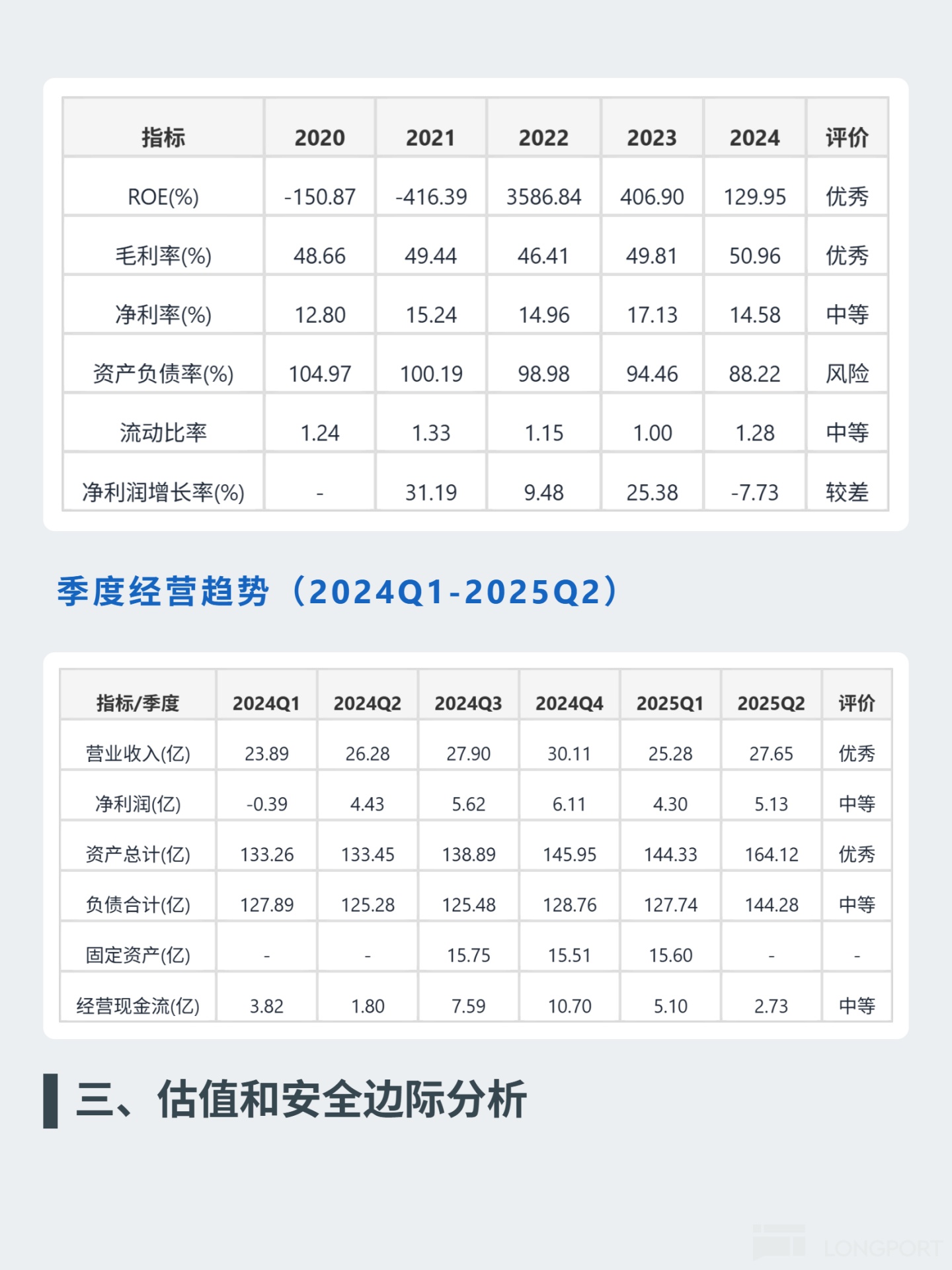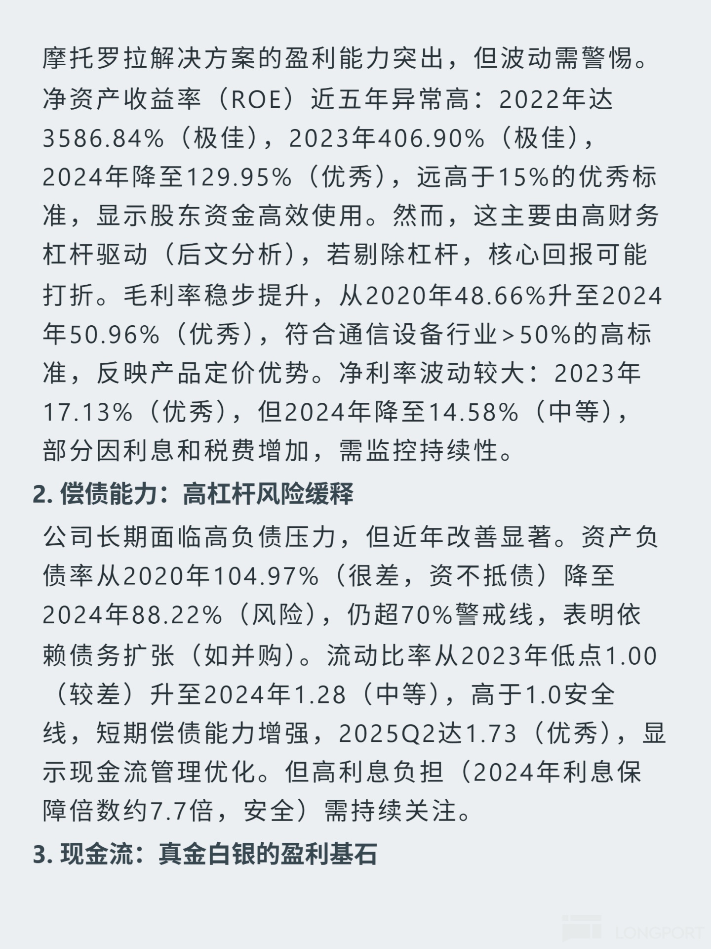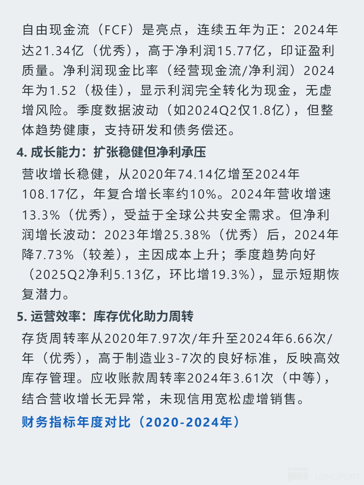 📈 Financial Highlights: Exceptional profitability with leverage dependence - 2024 ROE 129.95% (vs. 15% excellence benchmark), gross margin 50.96% (above 50% industry standard); positive FCF for 5 consecutive years (2024: $2.134B vs. net profit $1.577B); 10% revenue CAGR (2020: $7.414B → 2024: $10.817B) with 13.3% YoY growth in 2024; 2024 net profit declined 7.73% (mainly interest/tax expenses) but 2025Q2 net profit reached $513M (+19.3% QoQ); debt-to-equity ratio improved from 104.97% (2020) to 88.22% (2024) (still above 70% warning threshold); current ratio 1.73 (2025Q2) shows strong short-term liquidity; inventory turnover 6.66x (2024) exceeds manufacturing industry benchmark (3-7x).