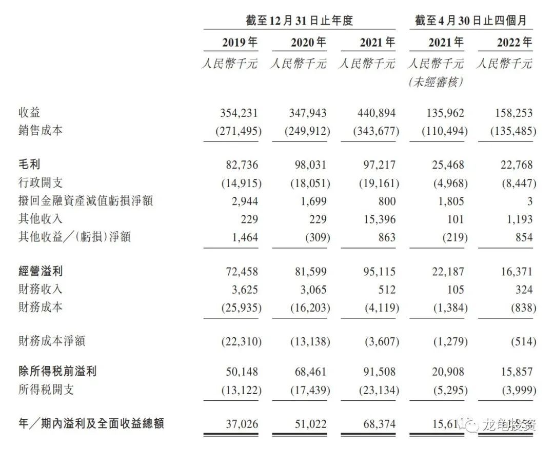 年内溢利:2019 年净利 3702.6 万人民币,2020 年净利 5102.2 万人民币,2021 年净利 6837.4 万人民币,2022 年截至 4 月底最近 12 月净利 6461.9 万人民币。